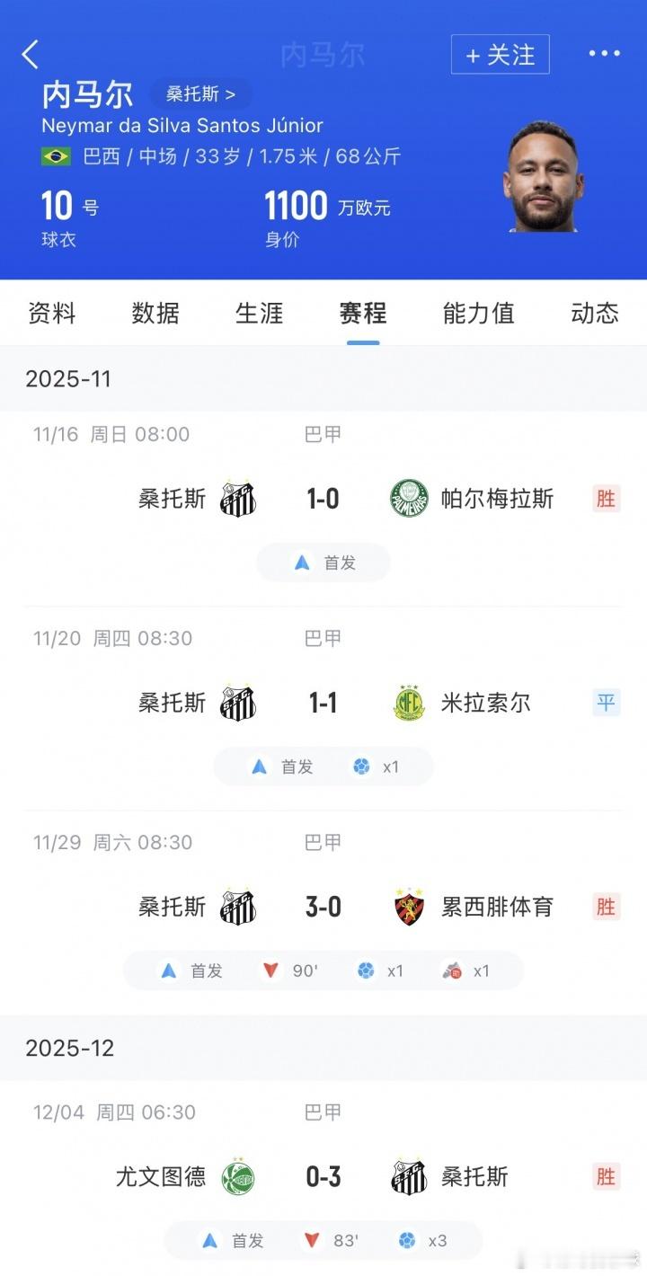 偶像的力量🤔内马尔社媒发有关科比的图片后,4场贡献5球1助自11月11日,内马尔在社媒单发了一张科比的经典时刻照片,随后在代表桑托斯的4场比赛里,球队战绩3胜1平,个人贡献5球1助。在昨晚巴甲第37轮,桑托斯3-0战胜尤文图德,内马尔戴帽,帮助球队远离降级区。