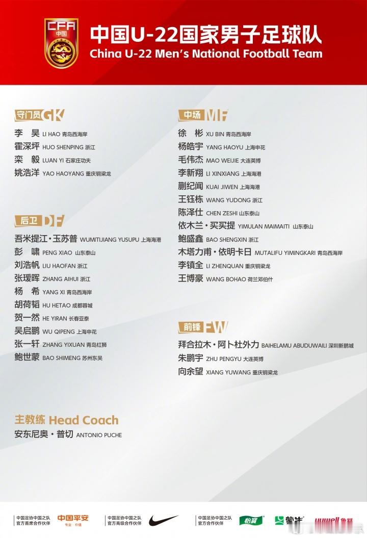 备战U23亚洲杯!U22国足名单:王钰栋领衔,刘诚宇、汪士钦缺席U22国足公布备战U23亚洲杯的名单,其中王钰栋、拜合拉木领衔,依木兰、向余望入选,刘诚宇、汪士钦缺席。U23亚洲杯明年1月在沙特进行,U22国足与伊拉克、澳大利亚和泰国队同分在D组。【官方公告】各有关俱乐部:为备战参加2026亚足联沙特阿拉伯U23亚洲杯,经队伍教练组研究、中国足球协会批准,中国U-22国家男子足球队定于2025年12月7日赴广东省肇庆市组织集训并赴阿联酋、沙特阿拉伯备战参赛。现将有关事宜通知如下:一、集训人员名单(一)教练员及管理保障人员主教练:安东尼奥·普切领队:杜立达管理:吴子乐助理教练:何塞·德拉萨格拉、黄博文体能教练:伊格纳乔·洛佩兹守门员教练:托莫·格鲁伊奇训练员:于大宝技术分析师:大卫·坎皮罗、王栋梁机能监测师:侯明岳、张嘉麟队医:王磊运动防护师:姚康、苏星涛、钱纪云、赵浩然、姜闻宇队务:李石装备管理:王跃翻译:杨浩(二)运动员(29人)上海海港足球俱乐部:吾米提江·玉苏普、李新翔、蒯纪闻上海申花足球俱乐部:杨皓宇、吴启鹏成都蓉城足球俱乐部:胡荷韬山东泰山足球俱乐部:依木兰·买买提、陈泽仕、彭啸浙江职业足球俱乐部:霍深坪、鲍盛鑫、刘浩帆、王钰栋、张瑷晖长春亚泰足球俱乐部:贺一然青岛西海岸足球俱乐部:李昊、杨希、徐彬、木塔力甫·依明卡日深圳新鹏城足球俱乐部:拜合拉木·阿卜杜外力大连英博足球俱乐部:毛伟杰、朱鹏宇重庆铜梁龙足球俱乐部:向余望、李镇全、姚浩洋石家庄功夫足球俱乐部:栾毅苏州东吴足球俱乐部:鲍世蒙青岛红狮足球俱乐部:张一轩荷兰邓伯什足球俱乐部:王博豪U23亚洲杯中国队赛程(均为北京时间):1月8日周四22点 伊拉克队vs中国队 利雅得法赫德王子体育场1月11日周日19:30 中国队vs澳大利亚队 利雅得阿尔沙巴布体育场1月14日周三19:30 泰国队vs中国队 利雅得阿尔沙巴布体育场