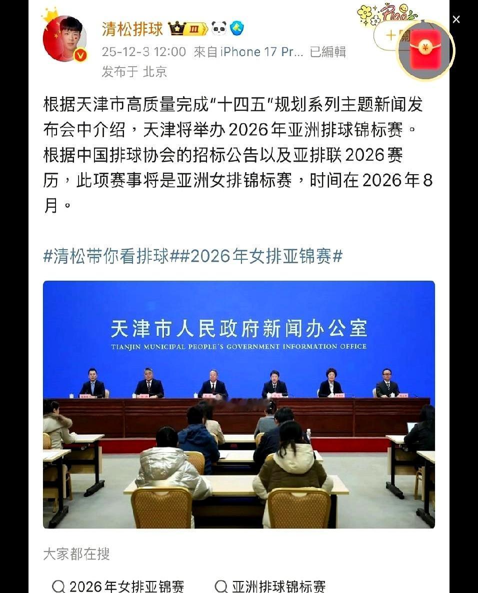 【天津将承办2026年亚洲女排锦标赛】 天津将在2026年8月办亚洲女排锦标赛,明年亚锦赛冠军直通奥运,女排主帅与队员阵容受关注。 我超希望朱婷、李盈莹、王媛媛能归队,不管谁执教,都盼女排抓住奥运资格机会,打出实力为国争光,咱中国女排肯定能行!