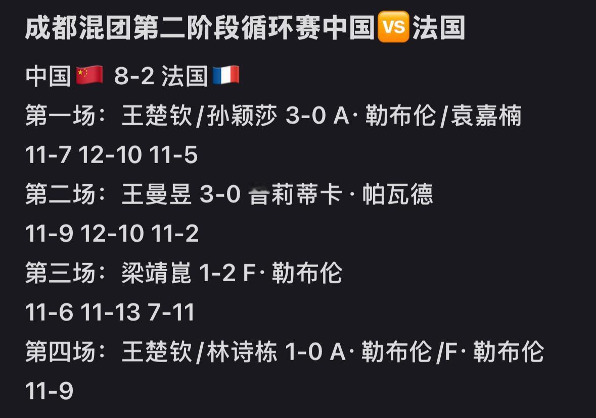 成都混团 第二阶段中国8:2法国的阵容就是对付日本的阵容 中国队VS日本, 其实那一盘都不能确保3:0, 所以5盘都要考虑到, 整个混团阵容就考虑到王楚钦 尽可能不连场, 孙颖莎/王楚钦打混双, 且混双 男双最强阵容都需要王楚钦, 男双王楚钦/林诗栋是最强组合, 不管对张本智和的胜率, 还是避免连场, 梁靖崑打男单是最适合的, 保一争二就可以, 其他几盘都保二争三做准备, 就够了! 今天的阵容就是最优解, 而且有男双女双兜底!