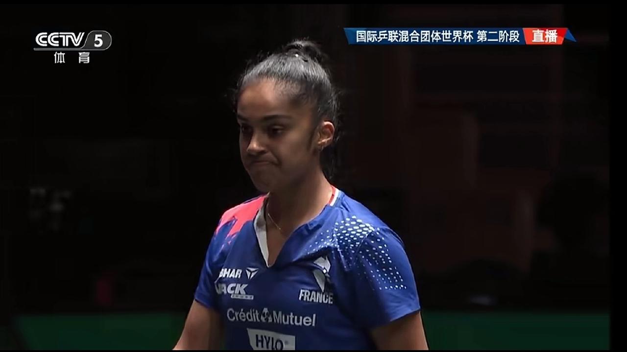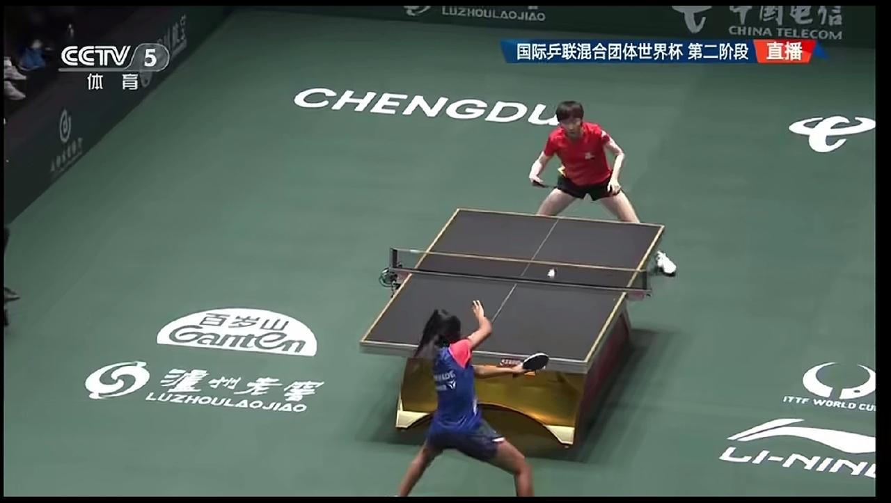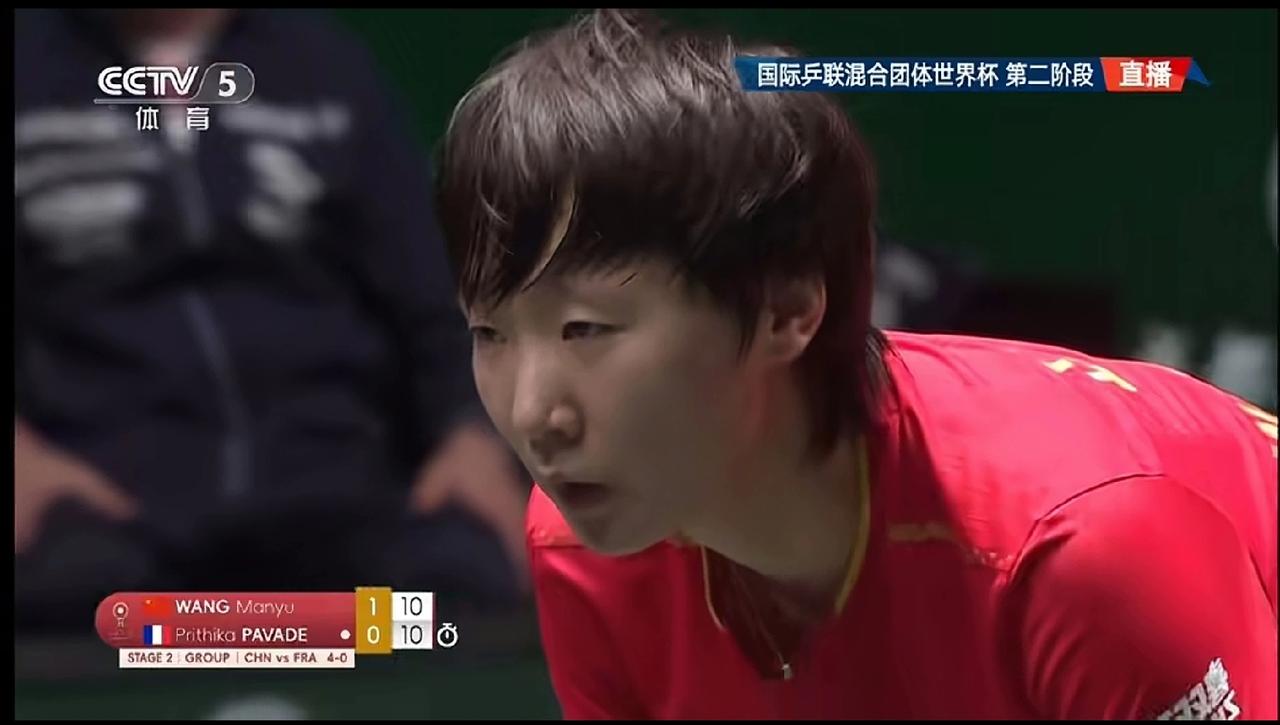混团比赛, 第二局王曼昱6:10落后, 在各种伤病缠身的情况下,一点点的把比分追到十平,直至逆转,堪称精彩! 对手发球,王曼昱一个半出台,对手回球出界,赢得一分,接着又率先变线,又得一分, 8:10了,法国小将有点慌,只能叫了暂停,可惜我们的曼昱心态稳得很,上来就让对手吃了一个发球,接着对手想抢攻,结果出界, 10:10了,对手心态真的崩了,接下来就直接拿下比赛了, 面对困境,不急不躁,通过调整,一分分的拿下比赛,给曼昱一个大大的赞!