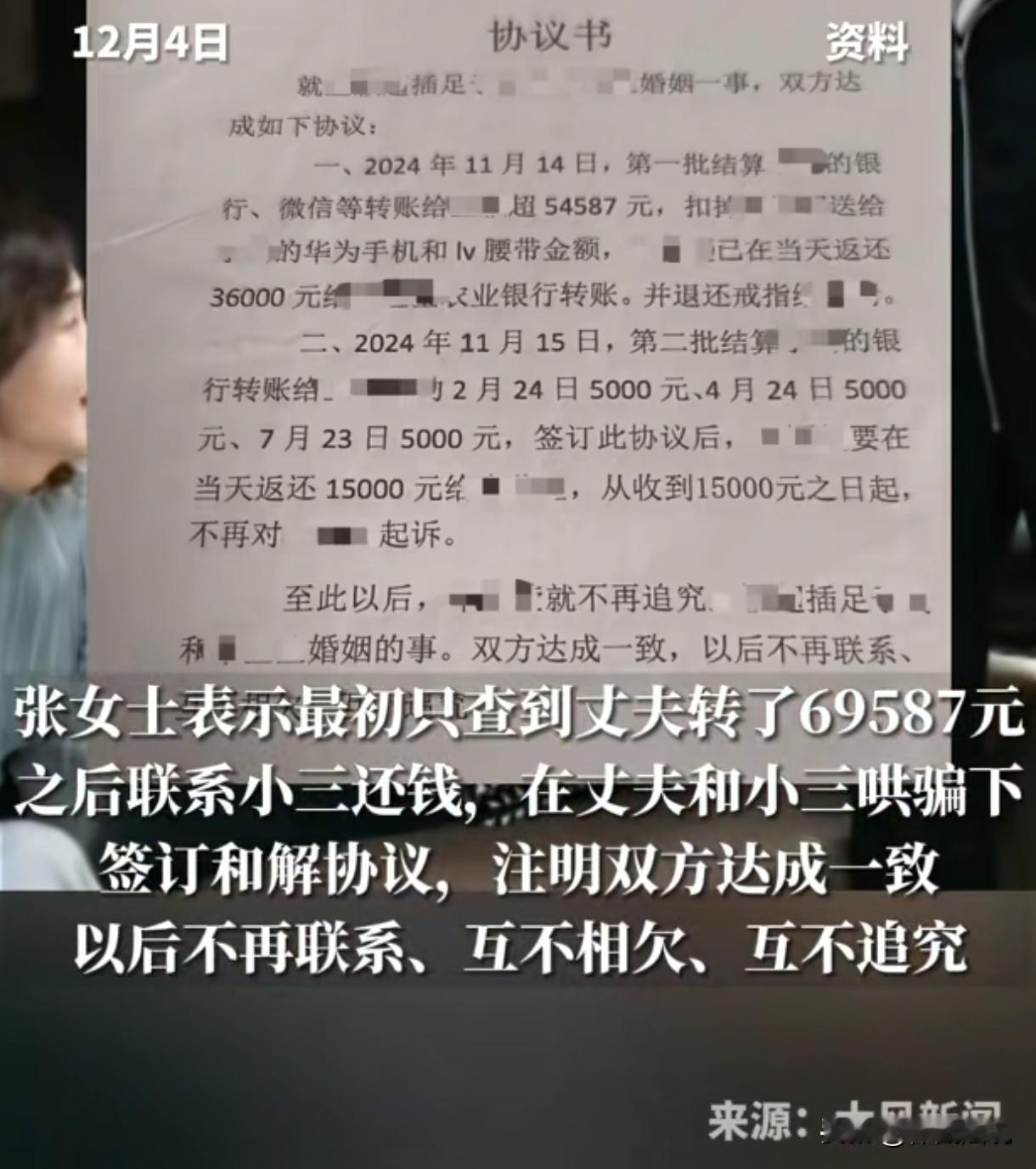 河南南阳,女子发现丈夫出轨,给情人转了6万余元,要求对方返还,双方达成和解协议: