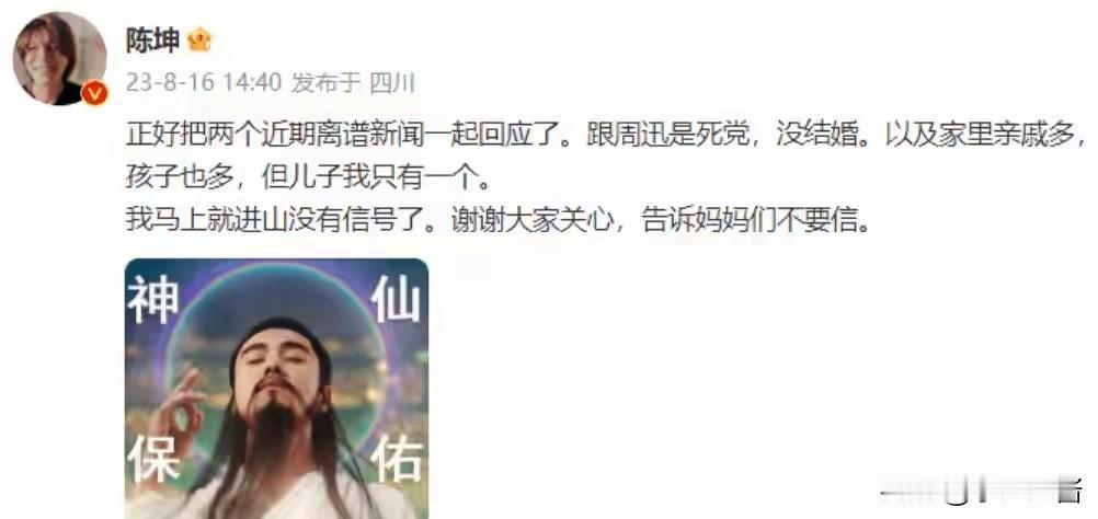 这才是,今天娱乐圈最大的瓜。 12做4日,49岁的陈坤,冲上热搜,这一次,不是因为好闺蜜周迅,而是有狗仔爆料,陈坤除了大儿子陈尊佑,疑似又有了一对双胞胎,网友一看,瞬间炸开了锅: “这次生母是谁![我想静静][我想静静]” 作为娱乐圈的实力派,陈坤身上有2个“未解之谜”,一是和周迅的关系,其次就是儿子的生母,至今都没有透露是谁。 和陈坤合作过的女演员,都被网友扒了个遍,网友没扒出个所以然来。 更有网友猜测,儿子是陈坤家保姆的。[我想静静] 这不,大儿子生母还没解决,狗仔再次爆料,陈坤疑似又有了双胞胎,带着他们出门,各种有爱互动,完全就像一个老父亲,不仅如此,这对双胞胎也不是第一次被拍到了。 不过,陈坤在23年的时候,就回应过,儿子只有一个,双胞胎是亲戚的。 如今,陈坤儿子陈尊佑,今年已经23岁,长得平平无奇,和陈坤一点都不像,这颜值,进娱乐圈估计也火不了吧。[泣不成声]