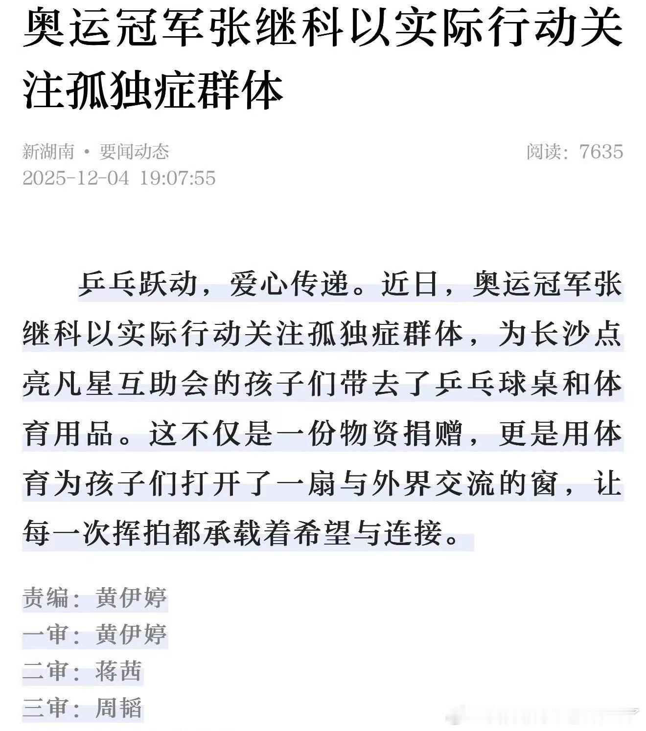 张继科关注孤独症群体 张继科的公益新行动!捐赠体育器材给孤独症儿童,用乒乓球运动帮助他们建立连接。冠军的担当不仅体现在赛场上,更体现在这样的爱心之举中。
