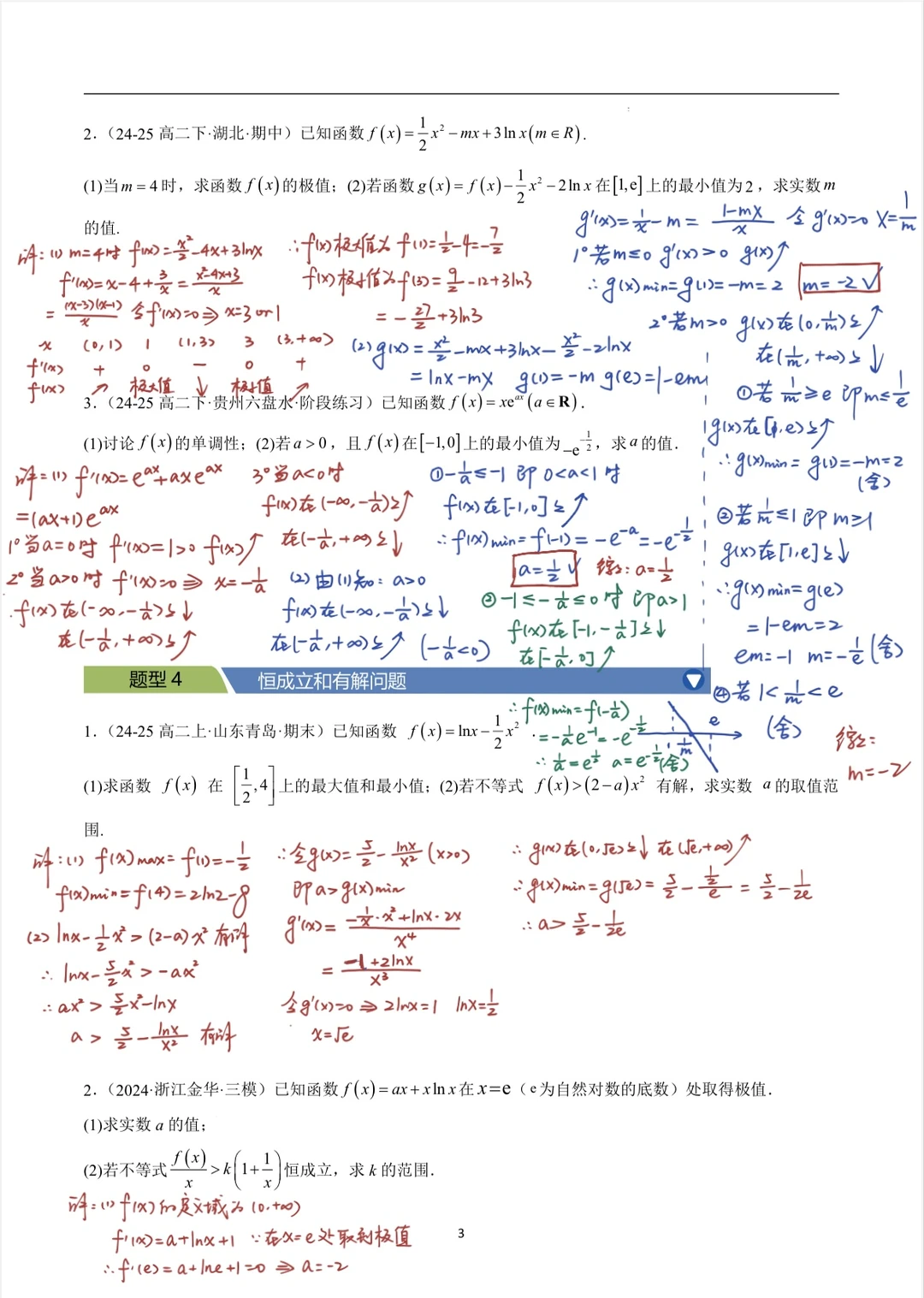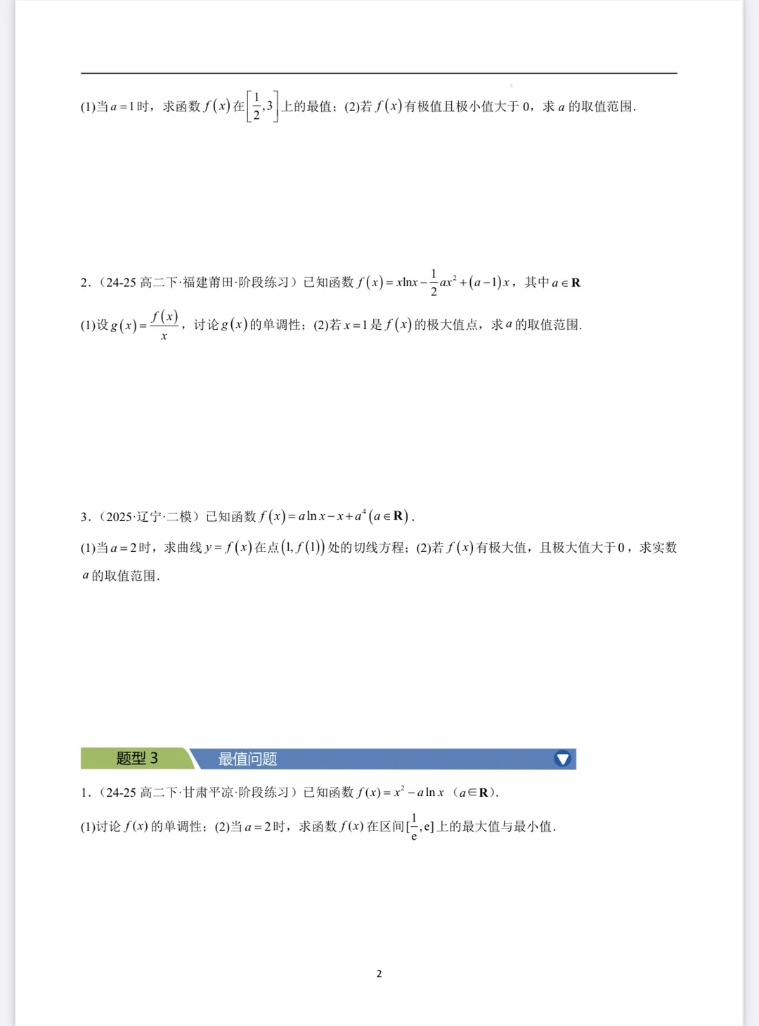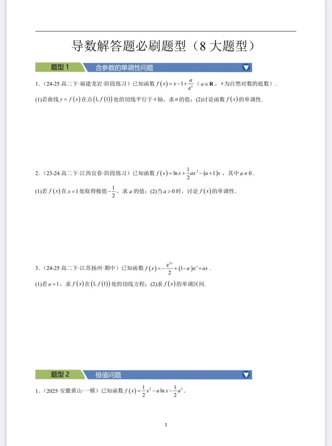 因为本次周考,18题导数题的得分率很低,所以给学生印了这个练习,一是学生做题比较少,对各类题型的思路不够明确,二是他们的书写又乱又差。 这次要求学生每天做3道,熟悉各类题型,重视书写!!!老师做好示范!