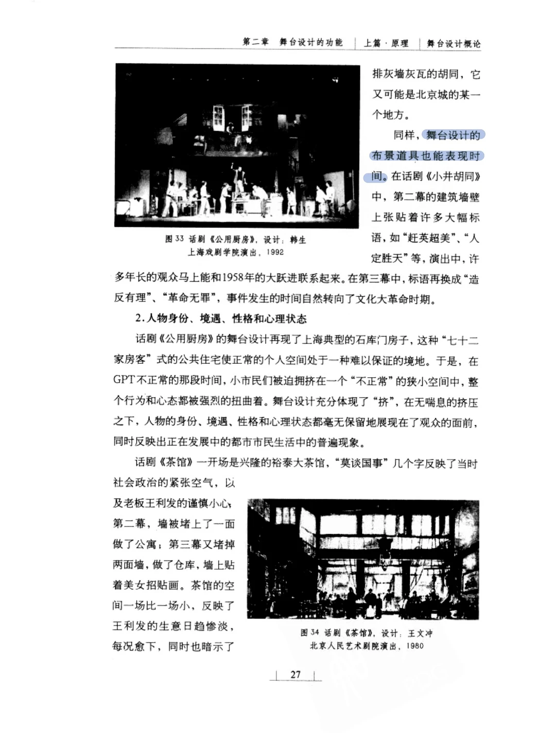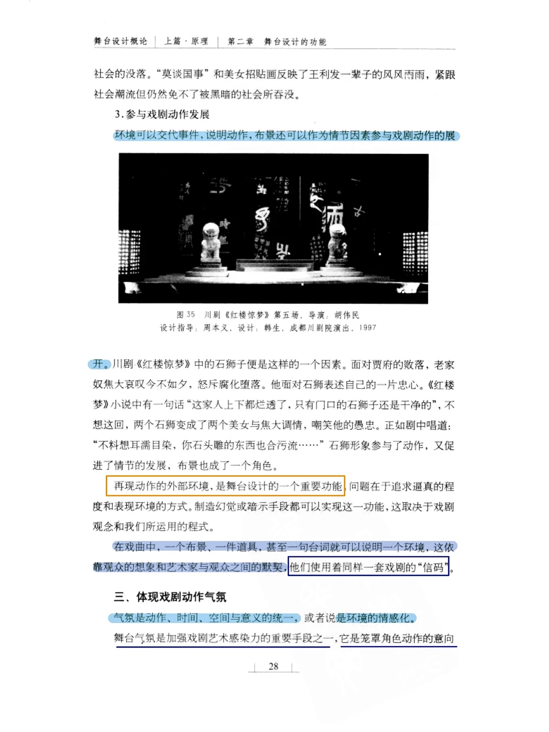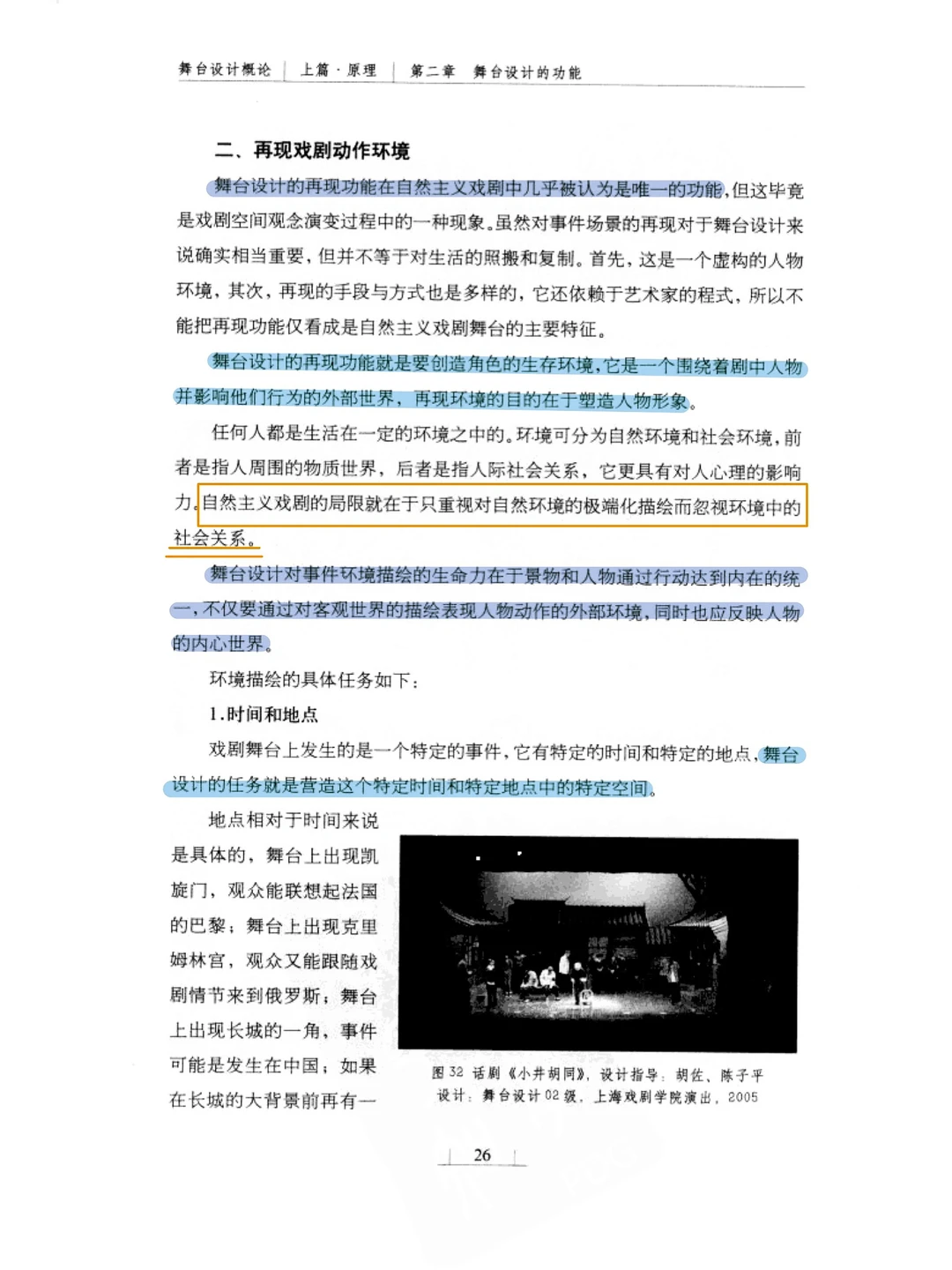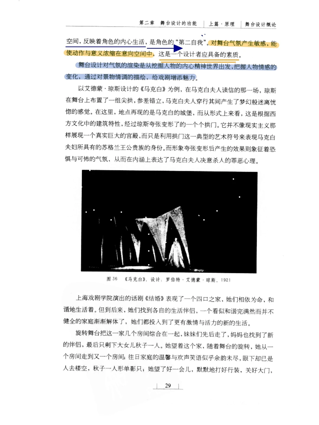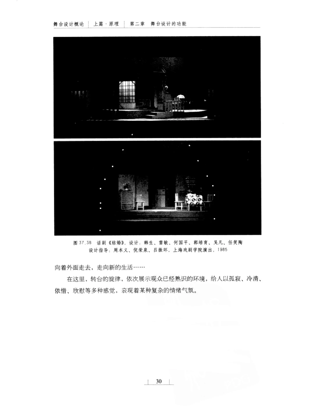 就可以说明一个环境…… 舞合设计在戏剧演出中不仅要创造一个对演员有用的实用空间,同时、这个空间还必须能体现康构事件中的戏剧动作环境和气氛。 戏剧演出活动中,舞合上存在着两个世界:一是现实世界,观众看戏,演员演戏:二是虚构世界,舞台上发生者一些事件,事件本身并不在场,舞合上的一切,进入了一个符号化的世界。 舞台空间既是现实的,又是虛幻的,既是演员的动作空间,又是角色的外部世界。因此,舞台空间是由一系列的艺术符号所创造的山幻空间,而在实际演出中,这些作为艺术符号的舞合形象,其意义超越了自身。
