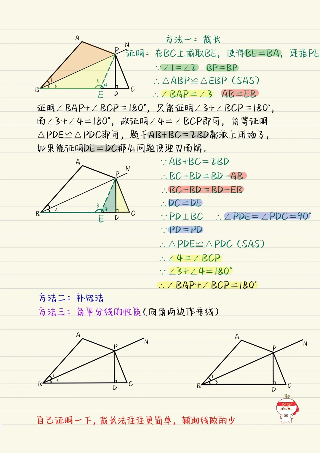 很多证明题可以通过截长补短构造全等三角形来解决,其中截长法也更容易一些。
