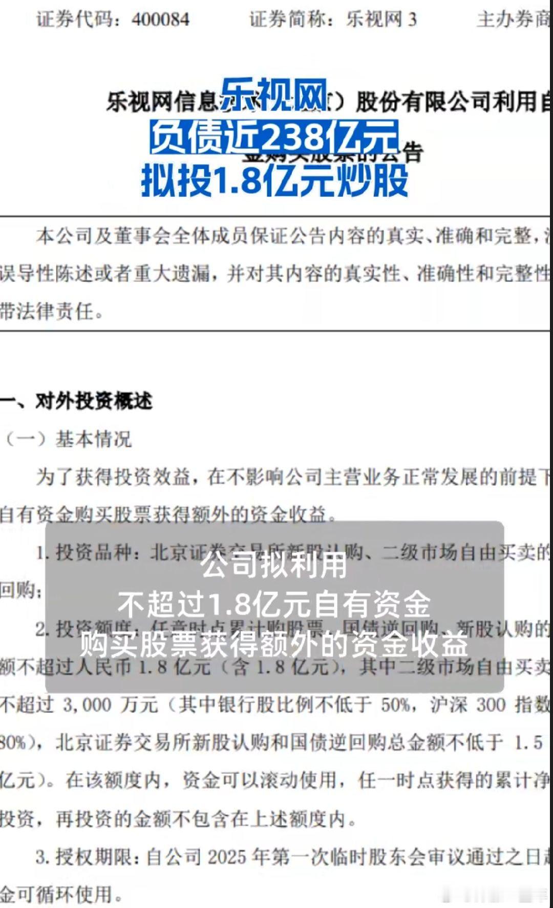 乐视网负债238亿拟花1.8亿炒股找个高手吧,用1.8亿翻个100多倍,负债不