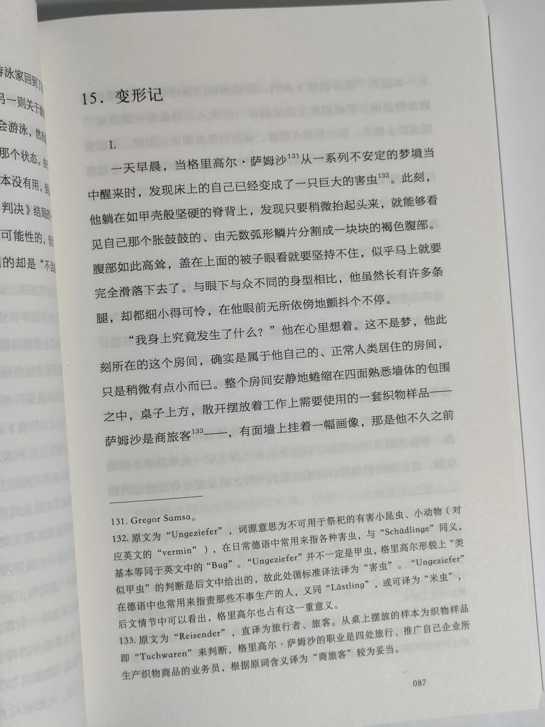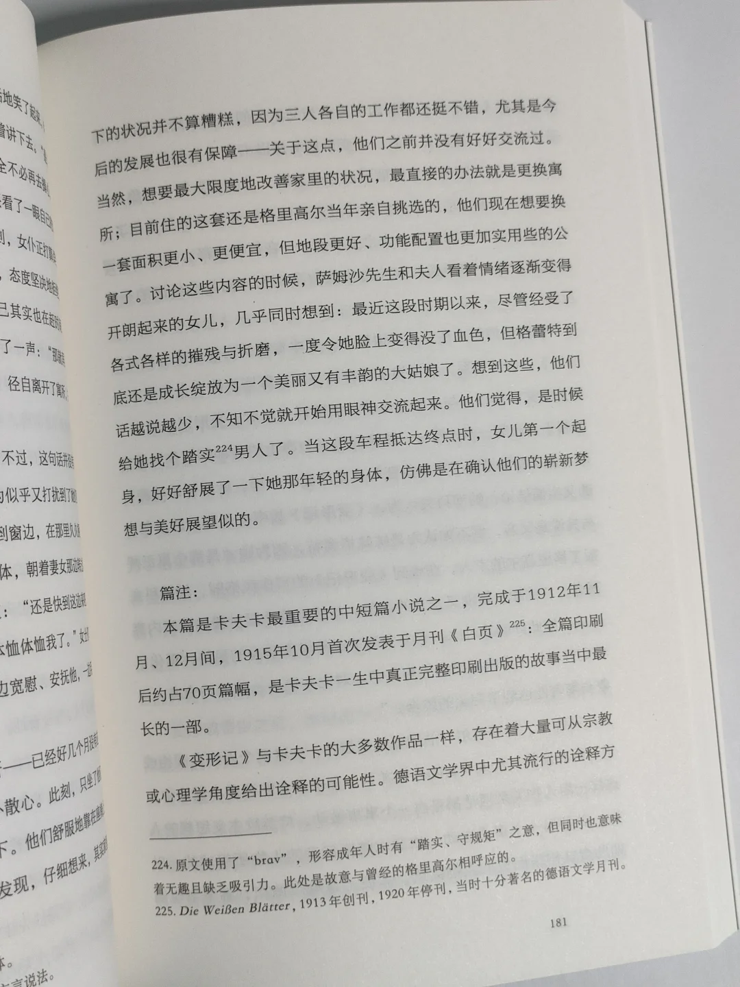 看到果麦出品的《变形记:卡夫卡中短篇小说全集》,精美轻便函套保护,选用胶版纸环保印刷,德文原版直译,一眼沦陷,果断入之。没想到,注释详尽,每篇后还有较长的篇注,真的太爱了。