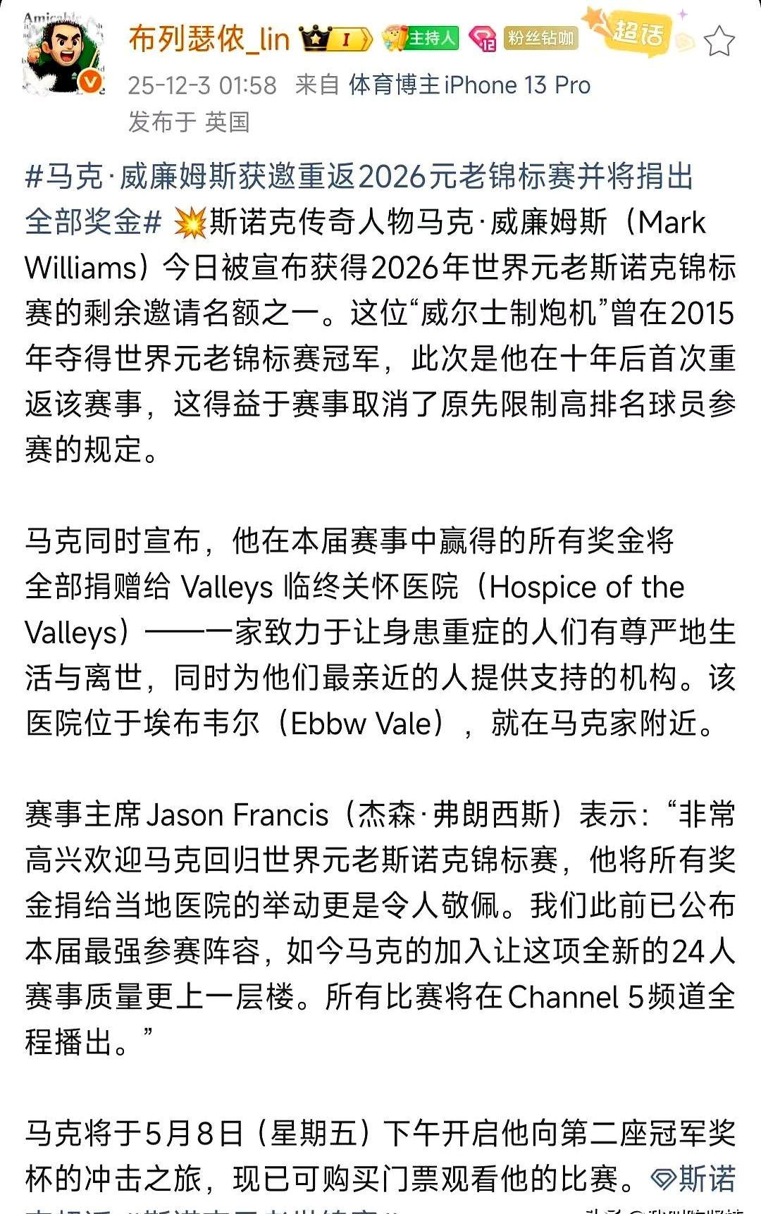 “金左手”威廉姆斯这波操作,格局直接拉满。 马克·威廉姆斯宣布重返元老赛,而且奖金一分不要,全捐了!预计超过10万元人民币,全部用来支持青少年台球发展。他一直都热心公益,这也不是头一回,不是头一回了。 很多人奇怪他为啥之前不参加。其实是规则不让。十年前他拿过这比赛冠军,后来赛事归世台联管,他这种世界排名前列的职业选手反而没资格。现在赛事独立运营,从2023年起改成邀请制,这才把他给请了回来。 现在的元老赛也完全不一样了。奖金池提升到50万元,亨德利、怀特这些传奇老炮儿也都来了,新赛季总共8位名将参与。威廉姆斯自己状态好得很,2023年世锦赛还打进八强,他就是想多打点有趣的比赛,顺便回馈粉丝。 这事一出,球迷都炸了,社交媒体上相关话题阅读量直接破百万。 顶尖选手回归,加上这份善心,元老赛这下是真有看头了。