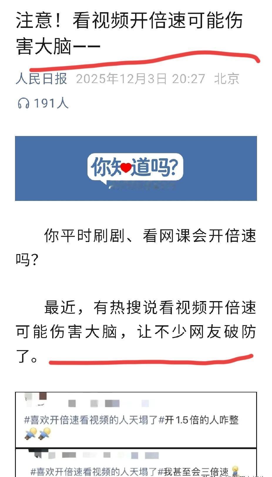 刷剧开2倍速这事儿,咱以前觉得是“效率”,现在看来可能是在“自残”! 人民日报之前就点名说过倍速追剧让大脑偷懒,最近传媒大学的新调研更是直接把咱那点侥幸心理给戳破了——长期2倍速,真的会变“笨”。 这可不是危言耸听,圈内人看了数据也是后背发凉。 根据调研,1.5倍速以内算是“安全区”,但凡你习惯了2倍速起步,注意力变短、看完记不住剧情那都是轻的,最怕的是深度理解能力退化。 我就说嘛,最近追个剧,明明看完了,转头连男二号叫啥都想不起来,原来是脑子处理信息的节奏被打乱了。 但也得替大家喊句冤,这事儿不能全怪观众。 数据显示65%的人都离不开倍速,为啥? 还不是因为现在有些剧集注水太严重! 明明20集能讲完非拖成40集,不开倍速真的会睡着。 咱们这是被注水剧逼出来的“生存技能”,结果反倒伤了自己,想想都觉得憋屈。 专家给的招儿倒是挺中肯:纯娱乐的烂剧你随便快进,但真正有营养的内容,还是耐着性子原速看吧,别让大脑习惯了“走马观花”。 话说回来,你最近一部从头到尾没开倍速、也没玩手机看完的剧是哪部? 评论区聊聊,我看还有多少“正常人”?