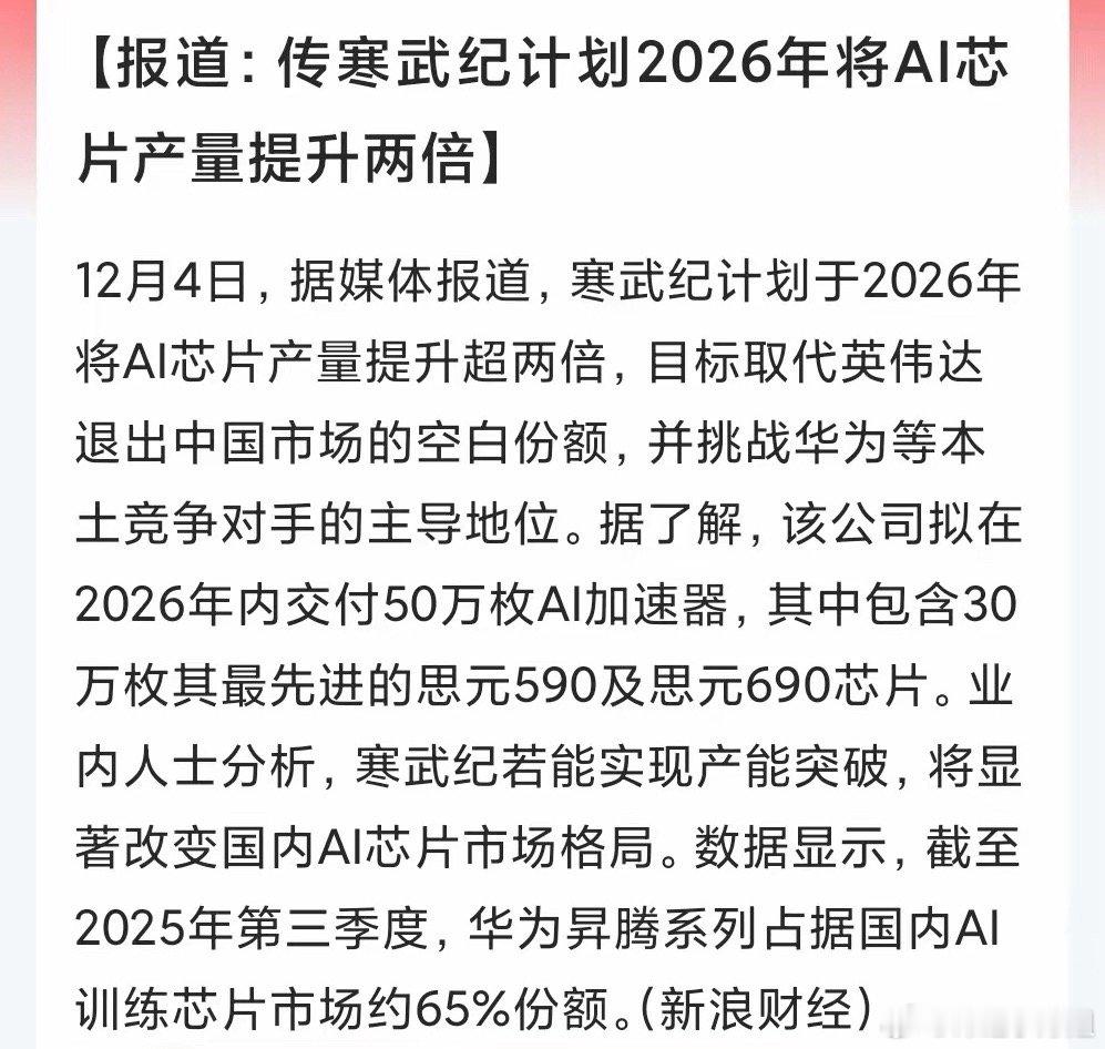 寒武纪2026年拟扩产两倍,AI国产链迎利好今日下午传出消息,寒武纪计划2026年将AI芯片产量提升两倍,以填补英伟达留下的市场份额。受此提振,寒武纪、中芯国际尾盘直线拉升。这一消息若落地,将为AI国产链带来重磅利好:一方面印证中芯国际先进代工能力实现突破,已具备批量供货实力,其等效7nm工艺良率超90%,已支撑华为昇腾等芯片量产;另一方面将为华为昇腾、寒武纪,以及即将上市的摩尔线程、沐曦股份等企业打开更大成长空间,国产AI芯片替代进程有望提速。产业链中,光模块、PCB、服务器、液冷设备等“卖铲子”企业堪称最大赢家——无论哪家AI芯片放量,都将带动其需求增长。不过需注意,光模块、CPO短期难掀主升浪,更多以轮动行情为主。AI国产芯片的加速放量,从黄仁勋的最新表态中亦可佐证。他坦言,即便美国允许向中国出口H200芯片,也不确定中国是否会购买,毕竟中国不会接受“阉割版”产品。H200虽仅落后Blackwell一代,属英伟达较先进芯片,但如今中国的态度明确:要么获得最先进技术,要么坚持自力更生。当前,美国AI产业面临“泡沫”压力,急需中国市场支撑,压力已转移至特朗普政府,就看其何时能放下封锁姿态,打开中国市场为自身产业“续命”。