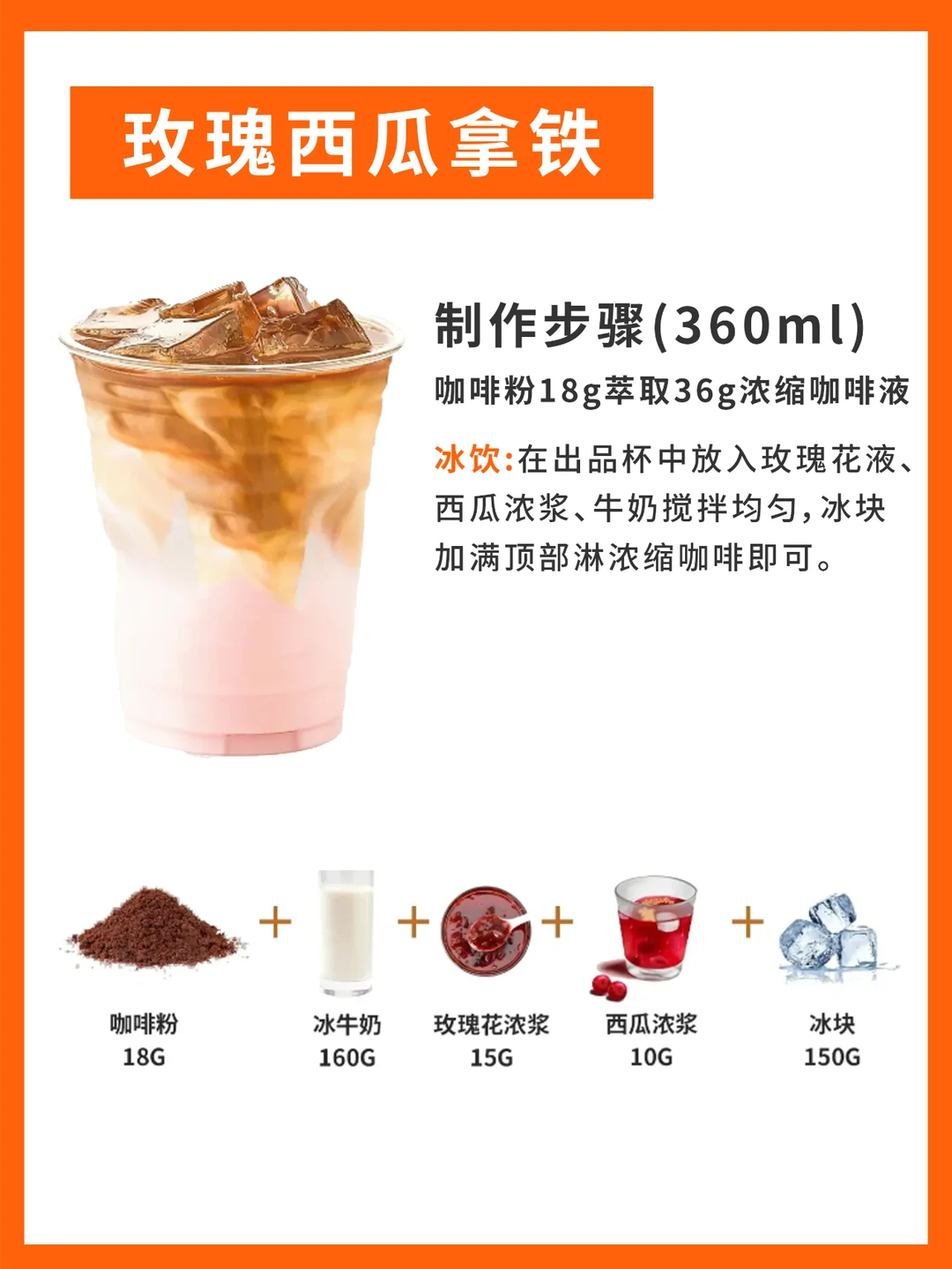 冰饮:在出品杯中放入玫瑰花液、西瓜浓浆、牛奶搅拌均匀,冰块加满顶部淋浓缩咖啡即可
