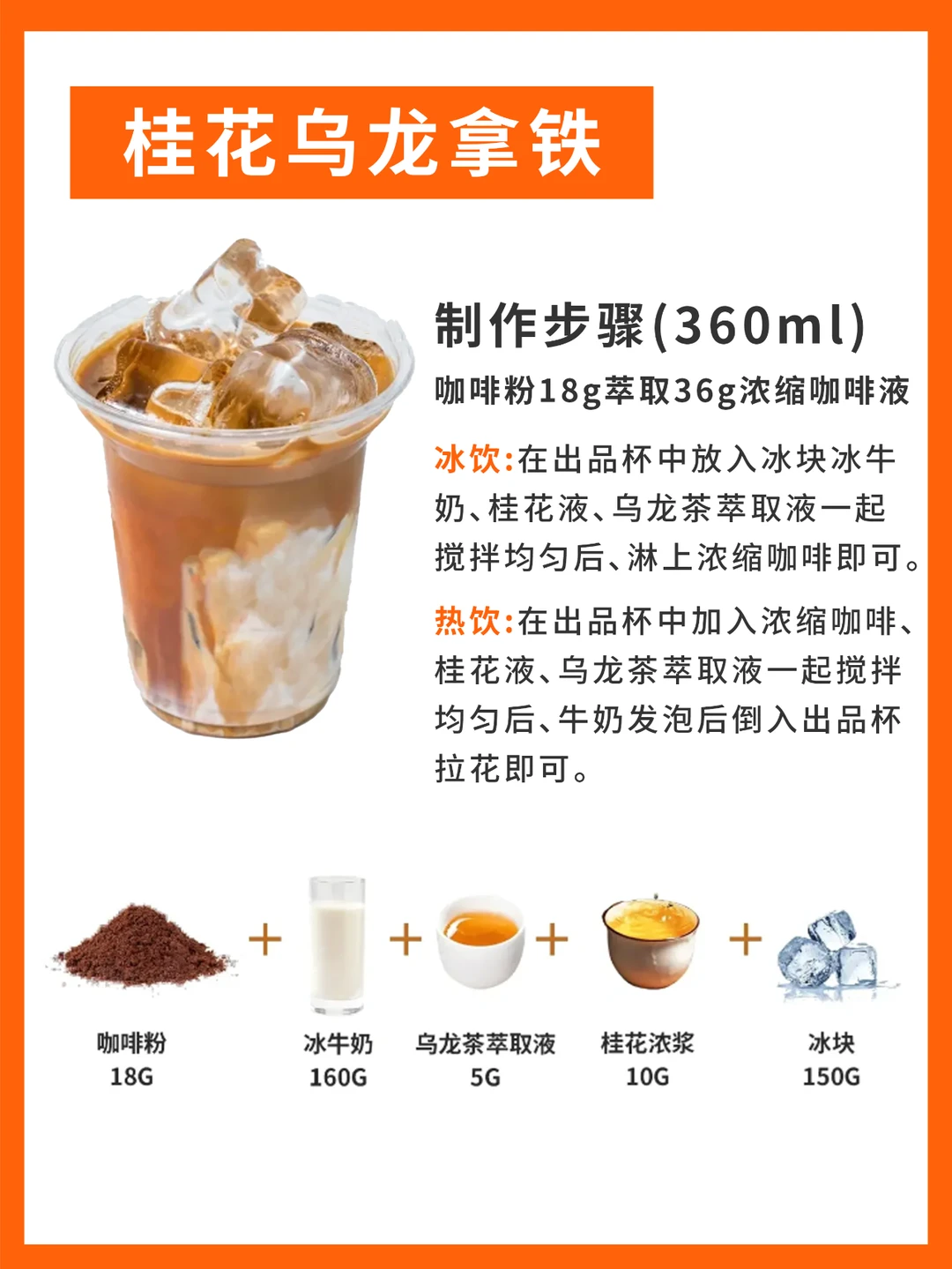 热饮:在出品杯中加入浓缩咖啡、桂花液、乌龙茶萃取液一起搅拌均匀后、牛奶发泡后倒入出品杯拉花即可