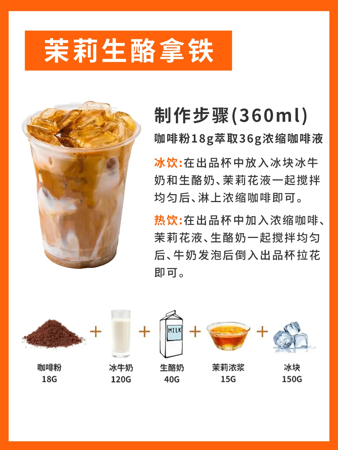 热饮:在出品杯中加入浓缩咖啡、茉莉花液、生酪奶一起搅拌均匀后、牛奶发泡后倒入出品杯拉花即可