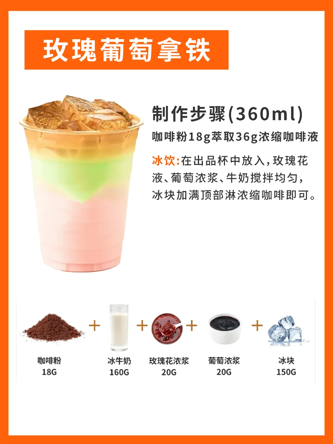冰饮:在出品杯中放入,玫瑰花液、葡萄浓浆、牛奶搅拌均匀,冰块加满顶部淋浓缩咖啡即可