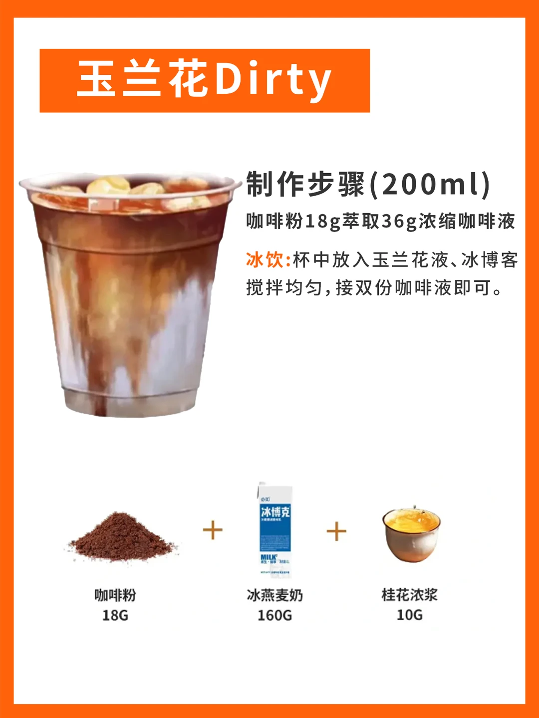 冰饮:杯中放入玉兰花液、冰博客搅拌均匀,接双份咖啡液即可