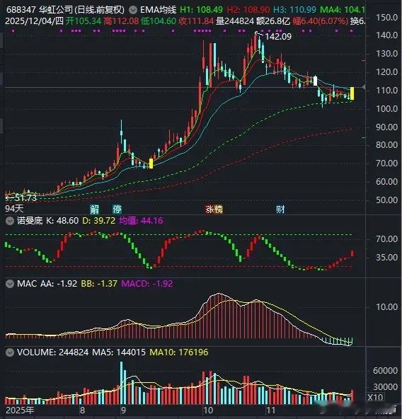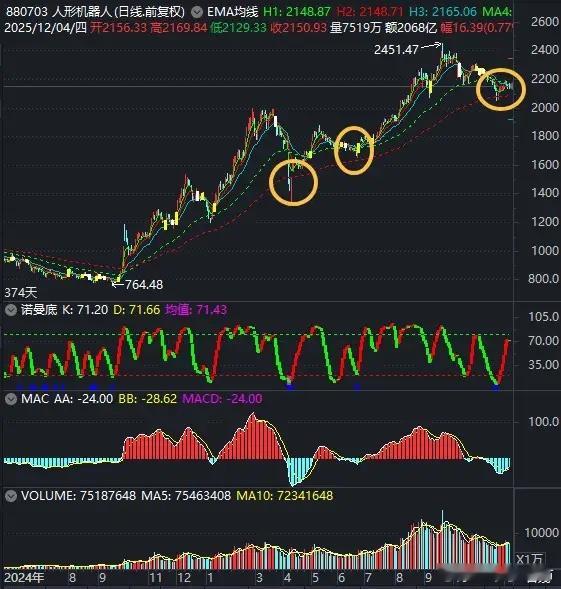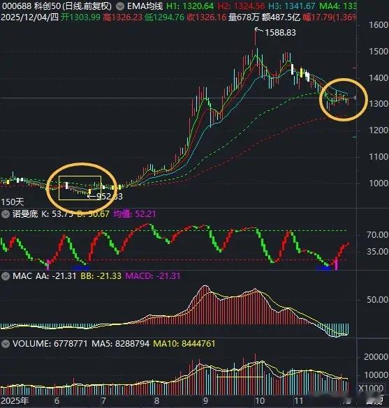科创50要提前见底?大盘今日小幅高开后一顿杀跌,10点20后出现拉升,翻红后似乎护盘任务完成了,股指归于平静,像心电图一样横了一下午,最终报收探底回升的小阴十字星。两市成交额1.55万亿,比昨日缩量1210亿。缩量,意味着转机不远了,但也意味着热点很容易一日游。盘面上,机器人概念股爆发,睿能科技、骏亚科技等10余股涨停。消息面上,有消息称美国政府正在考虑明年发布关于机器人的行政命令。另外,今日Figure创始人布雷特·阿德科克晒出了F.03人形机器人的跑步姿态,非常丝滑。A股上的机器人板块从国庆后开始调整,差不多跌了两个月了。上周四还出现了一个利空:国家发改委召开记者发布会,表示要注意防范重复度高的人形机器人产品“扎堆”上市。结果次日该板块不跌反涨,有点“该跌不跌”的意味。目前人形机器人指数还未出现买点,整体性机会还未来临,但可以把今日最受资金追捧的龙头股纳入自选股。一旦大盘调整到位,机器人也是主线的选项之一。另外,今日半导体崛起,华虹公司、拓荆科技、景嘉微、中微公司等涨幅居前,而且它们都还出现了“芙蓉出水”。科创50指数也是国庆后开跌的,也跌了差不多两个月了。今日它虽然表现不错,但才刚把均线拉平,还差一口气才芙蓉出水。在这种缩量的环境下,指数想要出现芙蓉出水,难度是比较大的。总体上,大盘今日杀跌后能探底回升,有否定二次探底的嫌疑。已经调整了两个月的科创50指数,出现了跌不动的迹象,但它才刚把均线拉平,有点类似6月10日至24的情形。只有当指数翻越了EMA20、EMA60,引发短期均线系统转变为多头排列,科创50的第三波就启动了(第五浪)。那一天,应该不远了,在12月中下旬应该见得到。==========盘后重要消息:1、欧盟已宣布终止在世贸组织诉我贸易限制措施案(案号:DS610)。商务部:是正确的选择。马克龙来访问,总得拿出一点诚意来。2、摩尔线程明日登陆A股,今日摩尔线程概念爆发,初灵信息、和而泰、盈趣科技、联美控股、大众公用纷纷涨停。今年有12只新股登陆科创板,上市首日平均涨幅270.39%。如果摩尔线程在上市首日能达到此平均涨幅,即当日最高价达422.84元/股,则中一签将赚超15万元,超越今年6月11日上市的影石创新,成为年内最赚钱新股。3、豆包手机首批3万台备货售罄后尚未追加物料,二代产品或2026年底出货。豆包手机作为工程样机,首批备货仅3万台,售罄后不再追加物料投入,短期内市场流通量固定。二手市场豆包手机价格被炒高,最高售价达7999元,远超官方定价3499元。