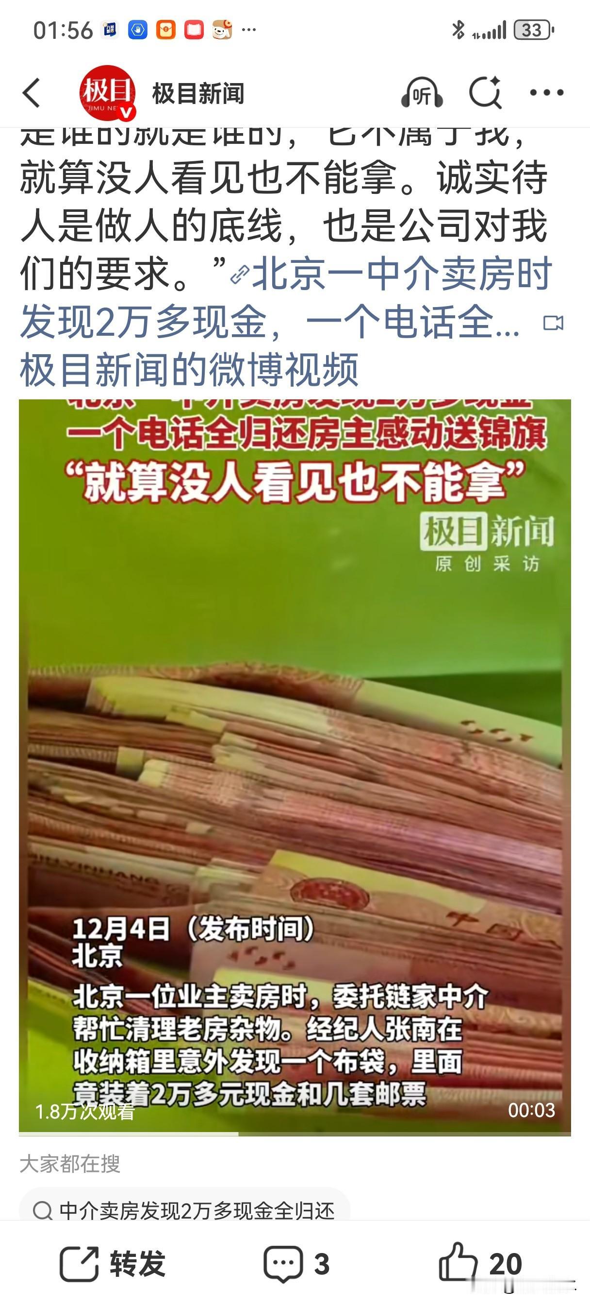 “真是拾金不昧!”北京业主卖房委托中介清理,经纪人张南在收纳箱发现2万多现金和珍贵邮票,马上联系业主回归。 房主刘先生说这钱是留给老人应急的,搬家忘拿了。感动之余,刘先生要发红包,张南婉拒,最后收了“拾金不昧”锦旗,钱物全归还了,还说“钱是谁的就是谁的,没人看见也不能拿,诚实是底线”。 做生意,就要讲诚信,坚持职业操守。张南守底线、有责任心,赢得了业主信任,中介口碑也获得了加分。 没人看见时还能守住本心,这才是真品格。张南用行动证明:诚实不是做给别人看,是做人的根——有根在,路才走得远!