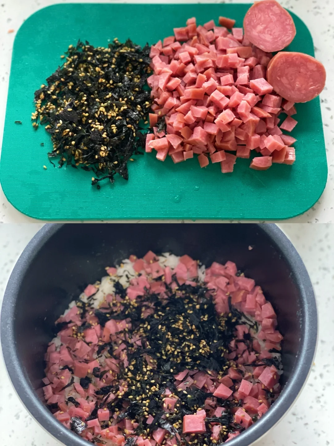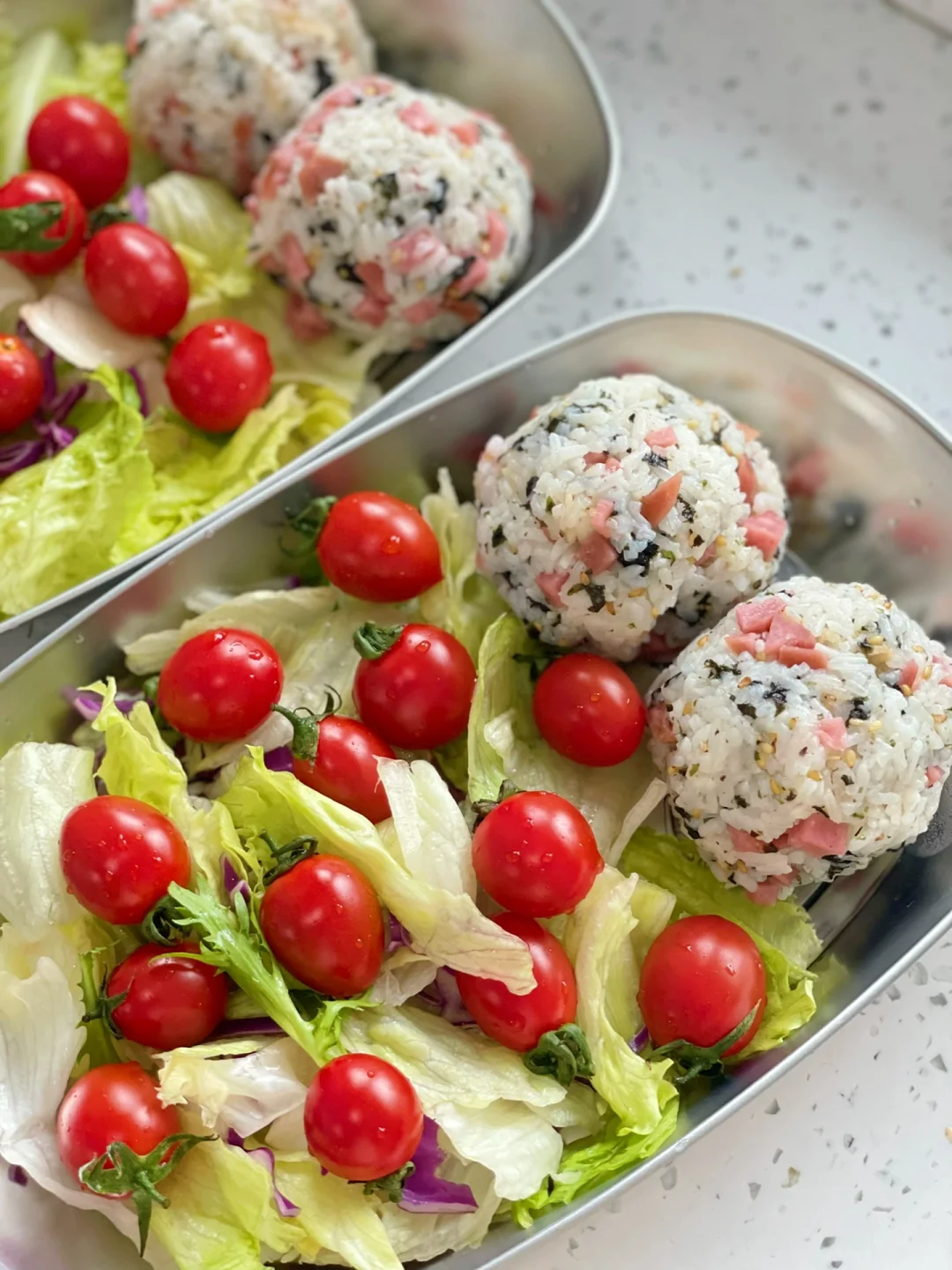 热气腾腾的三餐 脆皮肠海苔木鱼饭团 脆皮肠|米饭|拌饭海苔|木鱼素 1️⃣煮米饭的时候加入木鱼素,煮出来的米饭就是木鱼口味的。(具体的做法可以看看121期哦) 2️⃣即食脆皮肠切碎,拌饭海苔一起拌入饭里。带上手套捏成饭团就好啦。 ❤️脆皮肠、拌饭海苔、木鱼素都带有味道,不需要额外调味。平常多做一些放冰箱,加热就能吃挺方便的。 🌟搭配了一些生吃的沙拉菜,圣女果。作为今天午餐维生素的补充 🌟脆皮肠是玩铁猩猩家的,鸡肉的成份,热量也不高。开袋即食有时候举铁后饿了,也会来上一两个作为蛋白质补充。
