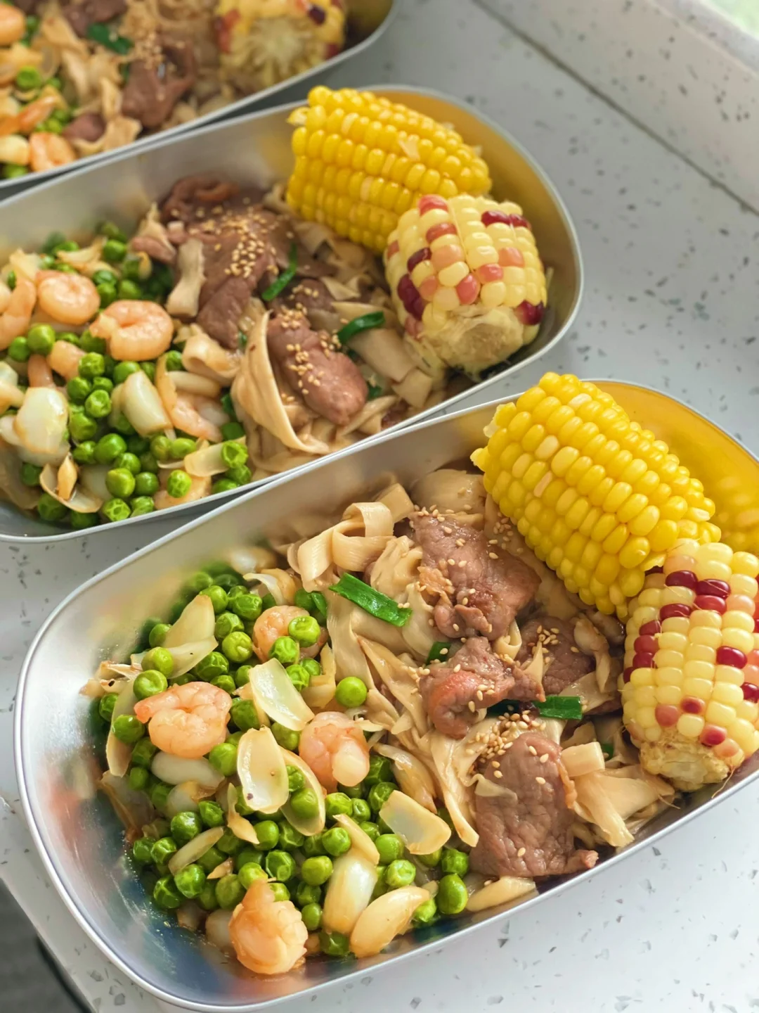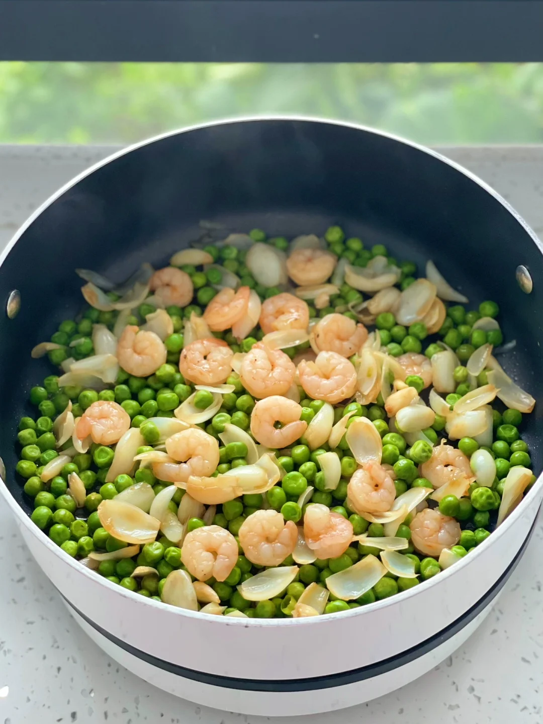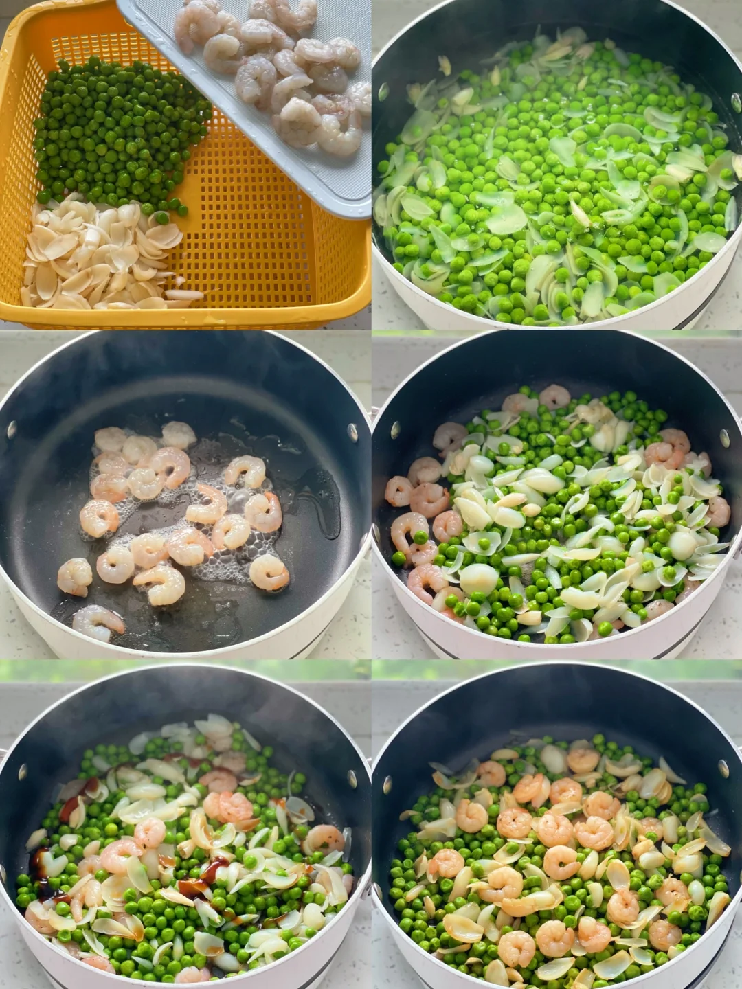 3️⃣青豆、百合一起下入虾仁中,蚝油、生抽调味