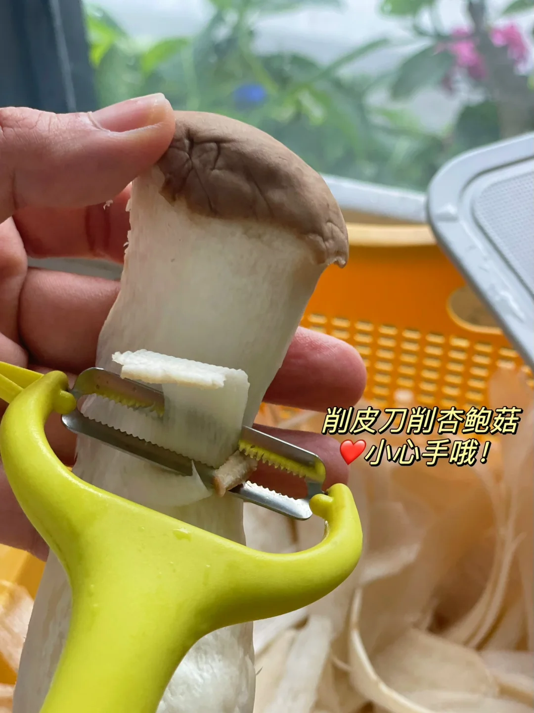 2️⃣杏鲍菇用削皮刀削成长条的薄片
