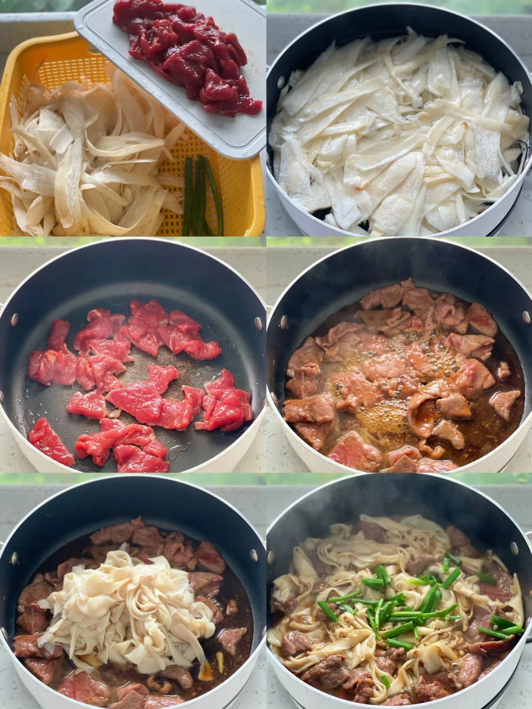 4️⃣锅里热油炒牛肉片,炒至5分熟的时候下入小半碗水、蚝油、生抽,下入杏鲍菇操作