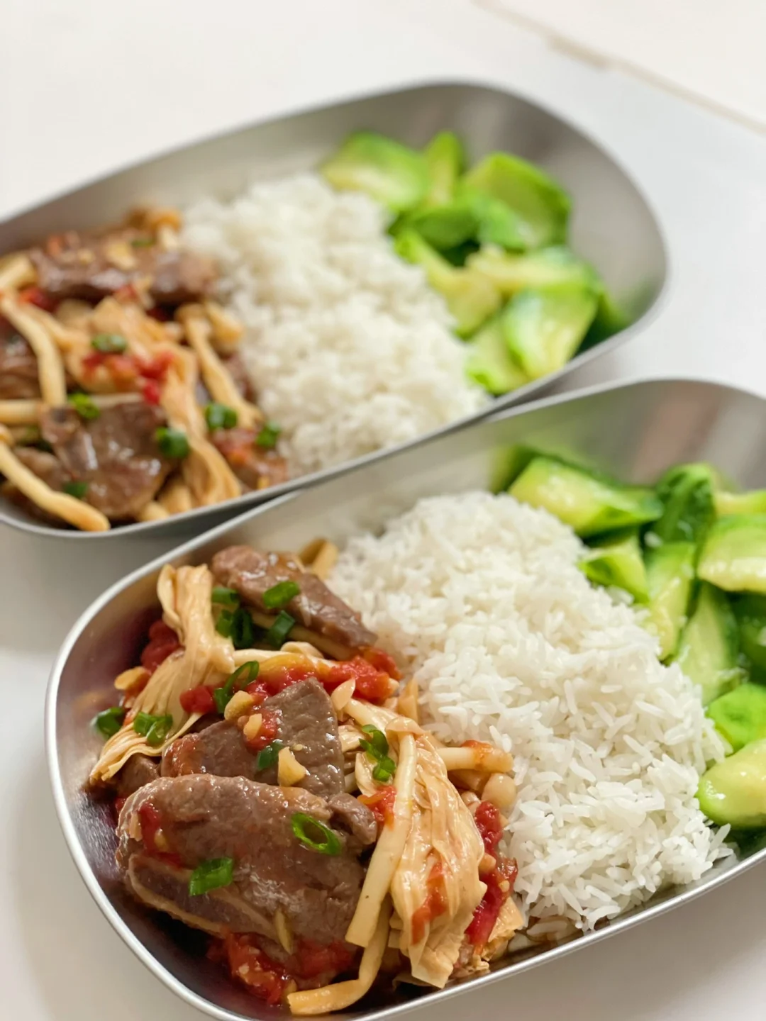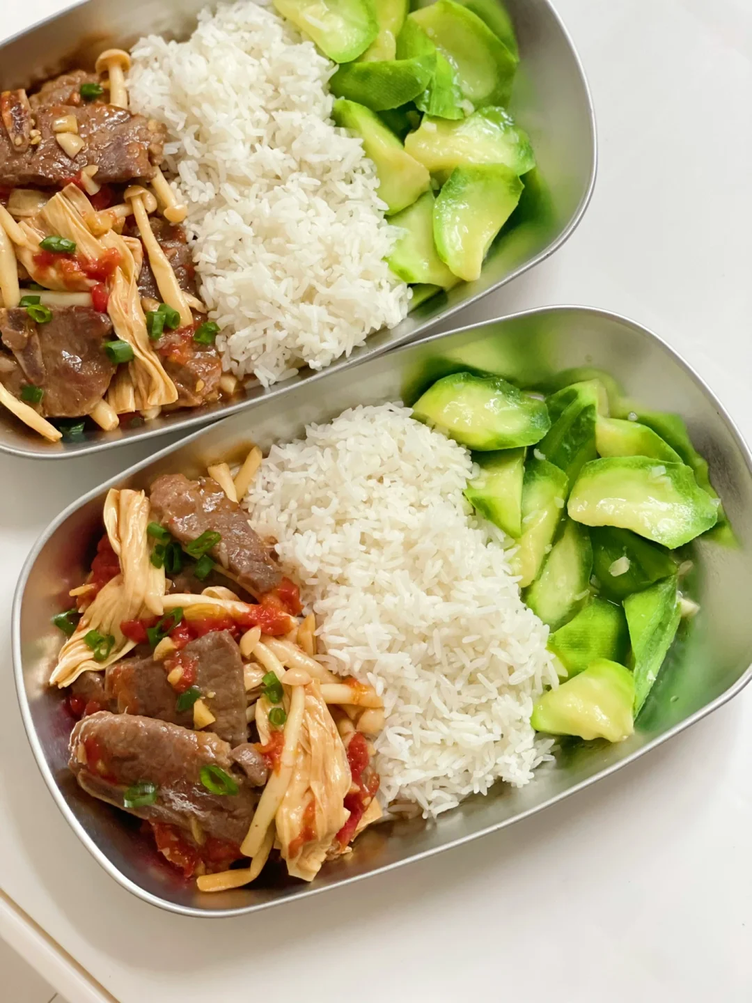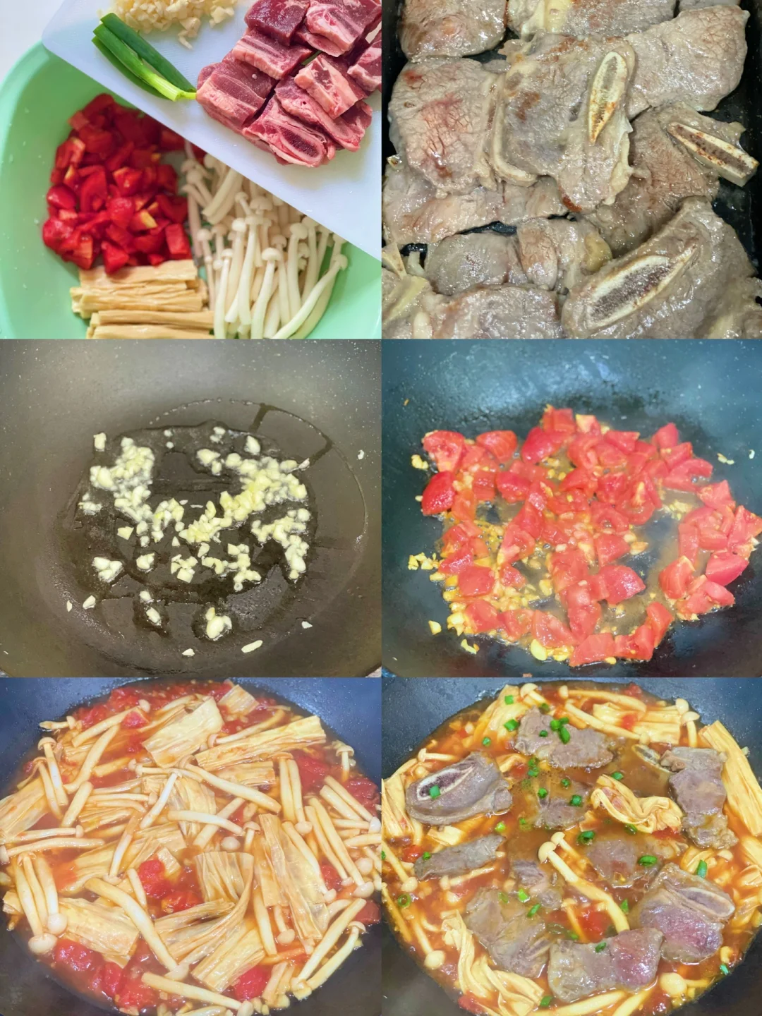 热气腾腾的三餐 🌟茄汁煮牛仔骨 牛仔骨|西红柿|腐竹|蘑菇|蚝油|生抽|盐|葱|蒜 1️⃣牛仔骨提前用蚝油腌制1小时以上。下锅煎至7成熟备用 2️⃣锅内炒香蒜末,下入西红柿丁炒软。蚝油:生抽调味,盖锅盖小火煮3分钟 3️⃣下入腐竹和蘑菇煮沸,再煮3分钟 4️⃣最后加入之前煎好的牛仔骨,撒上葱花就可以开吃啦 ❤️牛仔骨也可以用牛肉代替,腐竹吸收了茄汁拌米饭比肉还好吃 🌟蒜蓉炒丝瓜 🌟今日碳水白米饭