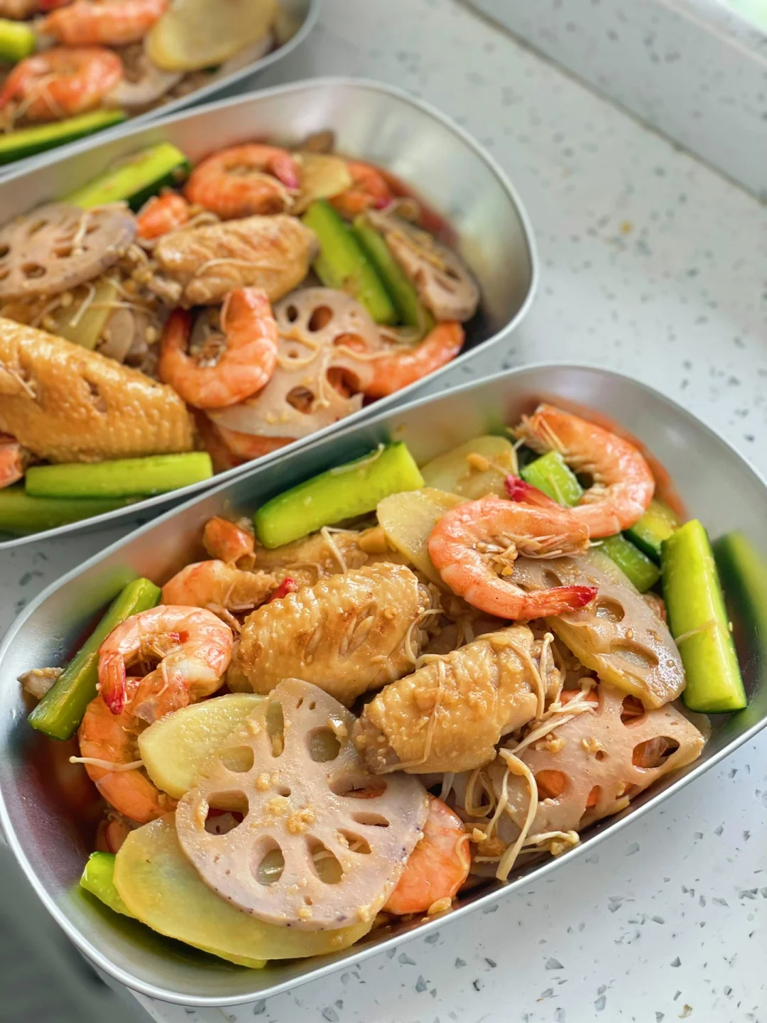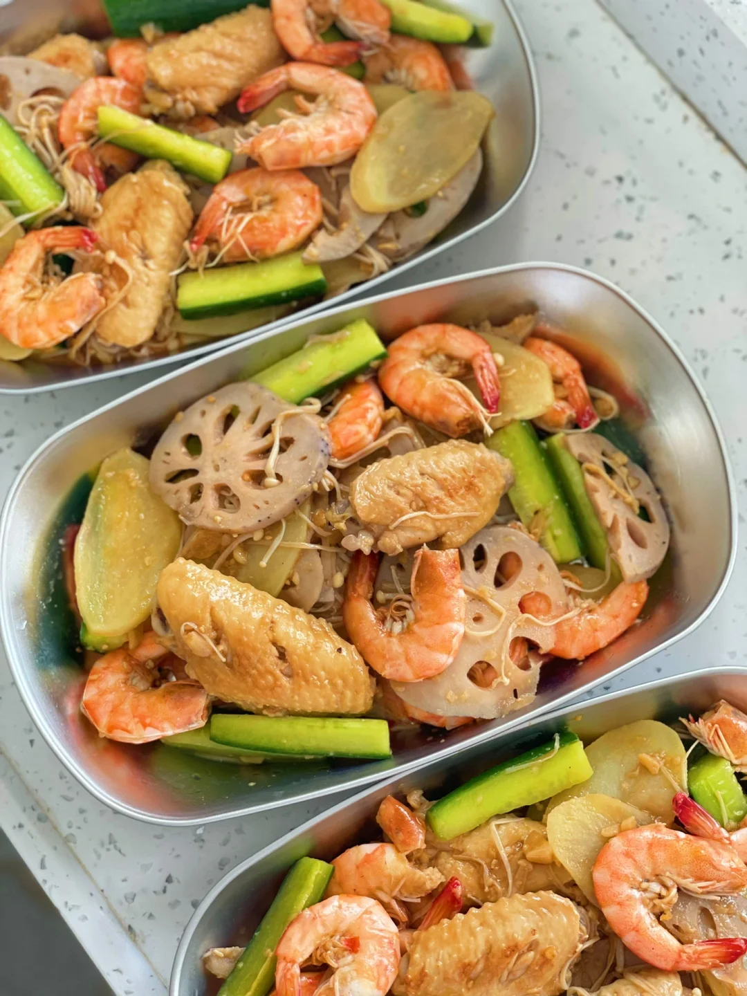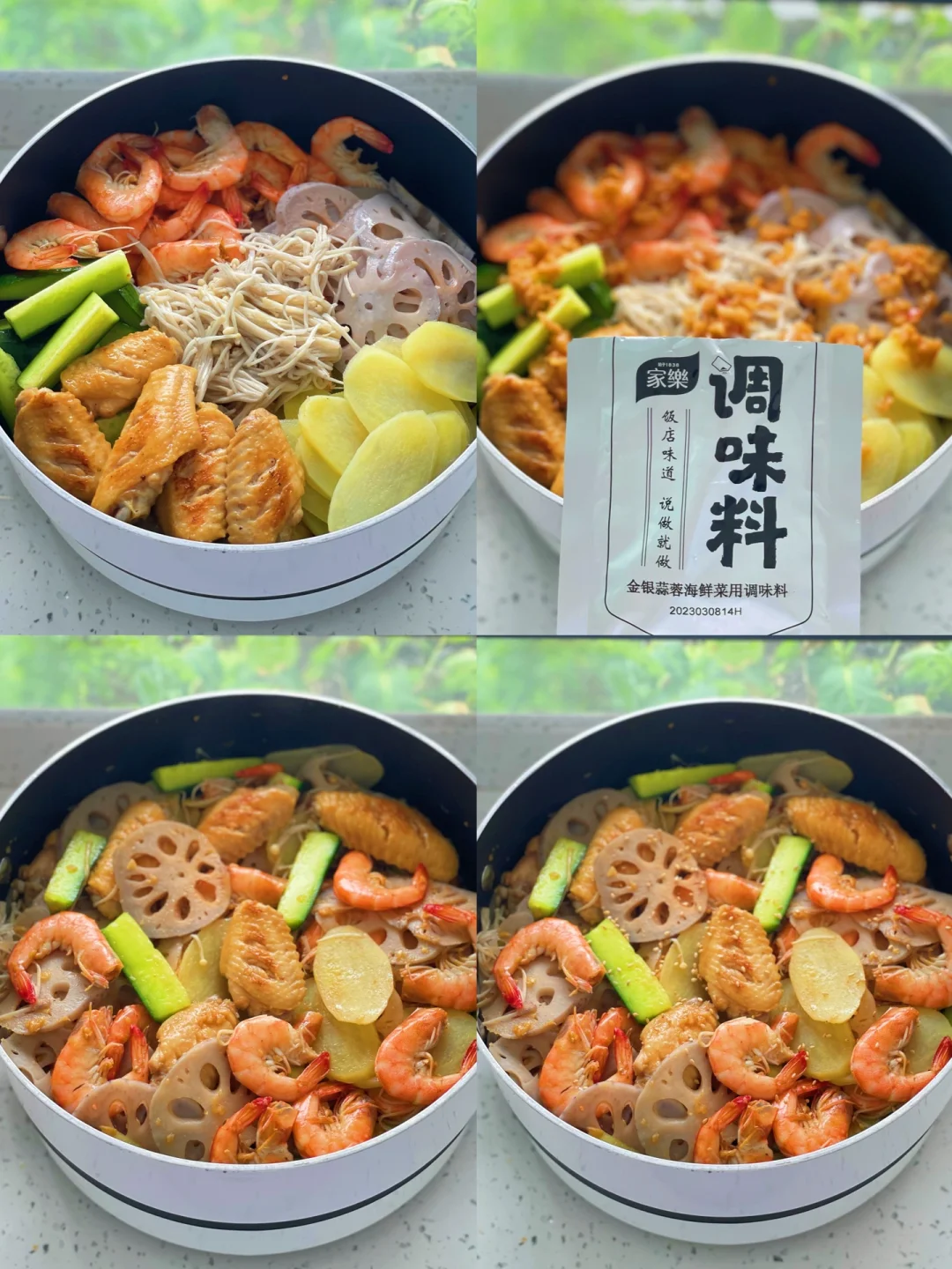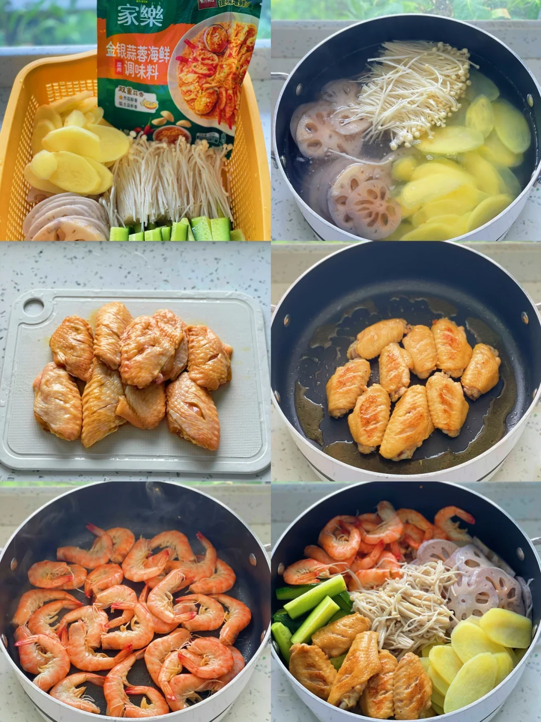 虾|鸡翅|土豆|藕|黄瓜|金针菇|白芝麻|家乐金银蒜蓉海鲜调料|生抽|蚝油|孜然粉