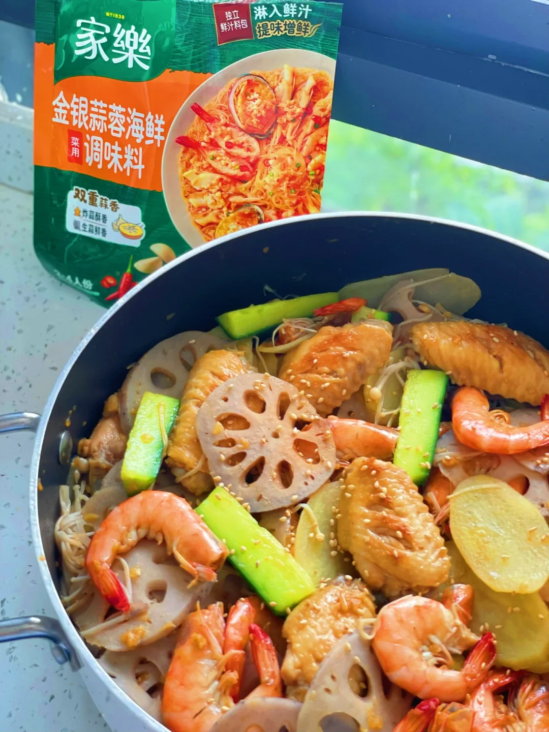 6️⃣最后把所有的食材放入锅中,倒入一包家乐金银蒜蓉海鲜调味料拌匀,撒上白芝麻就可以出锅啦