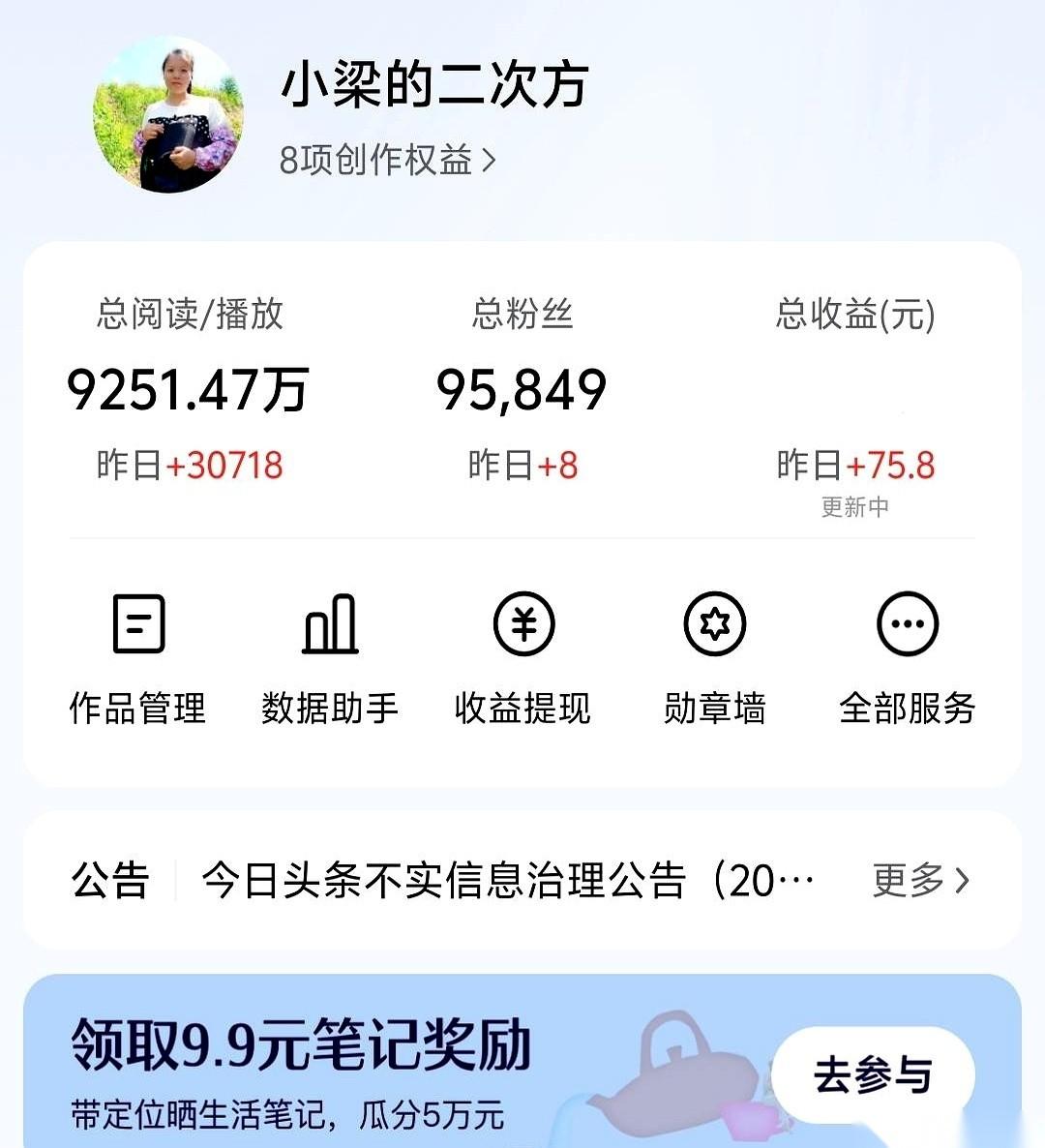 75块。 昨天肝了5篇稿子,换来3万阅读,就这点儿。 说多不多,说少,也还行,至少今天咖啡钱有了。 以前一天写3篇,觉得挺轻松。现在不行了,逼自己写5篇。 人为啥会累?说白了,不就是因为贪心了么。 总有人说,你这么拼,收益和付出也不成正比啊。 废话。 这世上哪有那么多正比? 但地你不耕,它就长草。你不写,后台的数字永远是个蛋。 这道理,比什么“坚持就是胜利”实在多了。 说出来不怕你笑话,写了一整年,连个“爆款”的影子都没摸着。 每天流量就那么两三万,稳得像我那雷打不动的体重。 人家是厚积薄发,我这就是小鸡啄米。 一口一口,一点一点。 累吗?有点。 但每天早上睁眼,打开后台看到的那个数字,它不是钱。 它是什么? 是你昨天没偷懒、没放弃的凭据。 就这么啄呗,挺好。