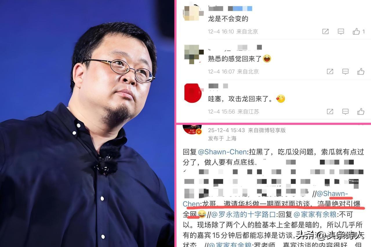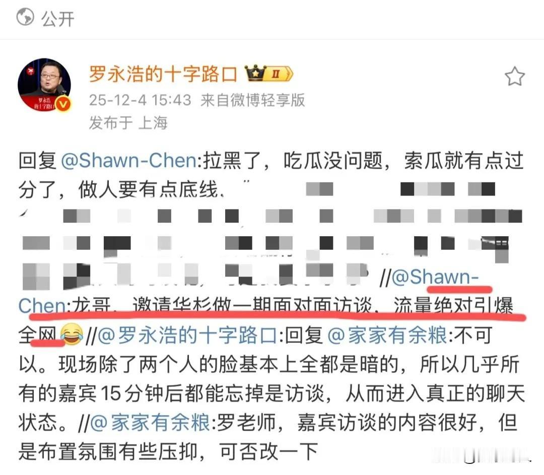 有网友建议 罗永浩 💥邀请华杉做访谈💥 罗永浩直接拉黑怒怼:“吃瓜没问题,索瓜就有点过分了,做人要有底线!” 此举也获得了不少网友支持:“熟悉的感觉回来了,‘攻击龙’回来了”。 老罗这次又炸了!网友提议他访谈华杉,直接被他拉黑怒怼:“吃瓜可以,索瓜过分了,做人要有底线!” 老罗此举,也获得了不少网友的支持👍👍: →“熟悉的感觉回来了,‘攻击龙’回来了” →“老罗这话虽狠,但没毛病。” →“吃瓜是围观,索瓜是伸手掏人家私生活,性质完全不同。” 老罗暴躁背后,其实戳中了一个怪圈:我们总把公众人物当“公共资源”,却忘了他们也有拒绝被消费的权利。 💡这事提醒我们:关注可以,别越界;好奇没错,要有度。网络时代,保持距离感反而成了最难得的尊重。