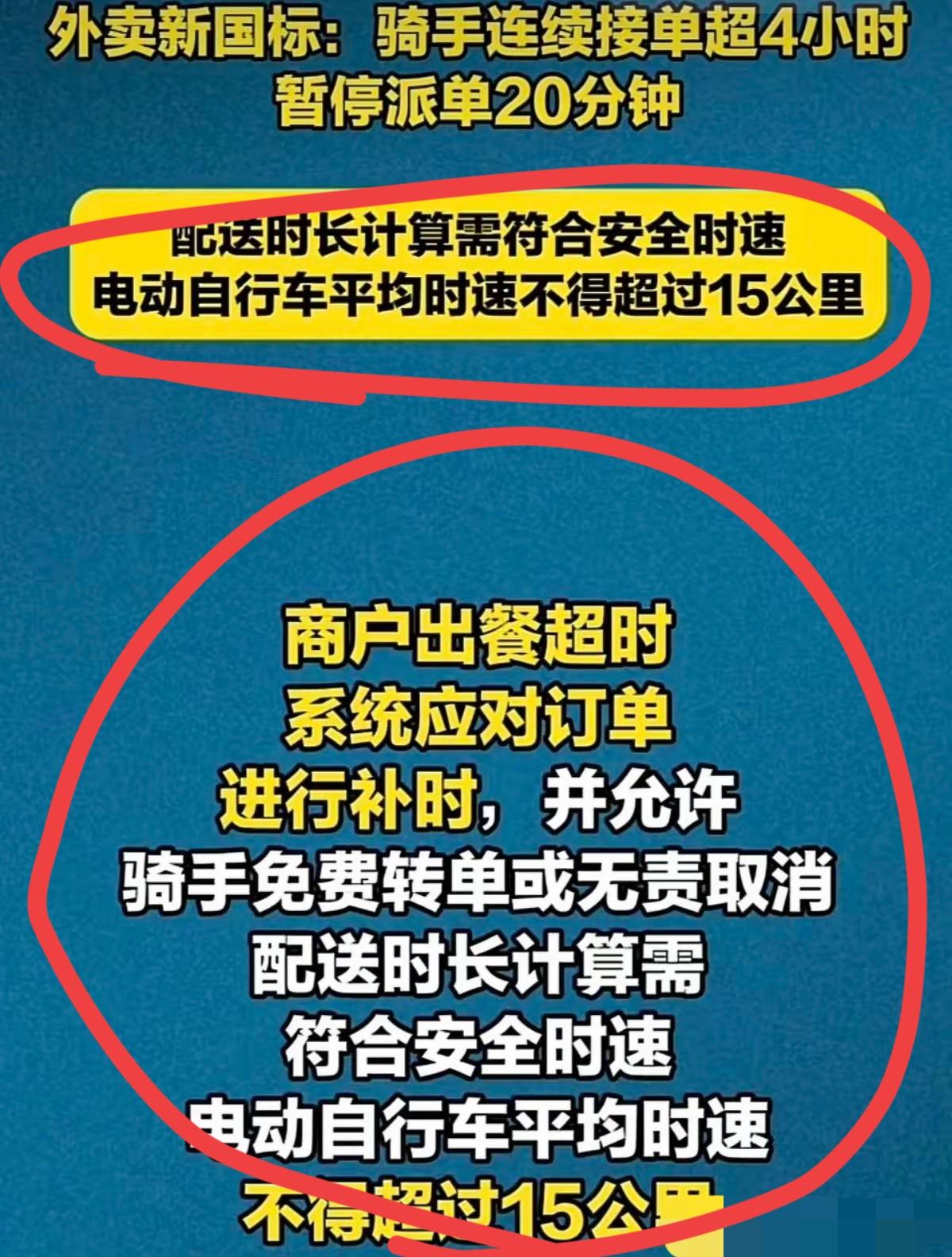 不得不说,外卖小哥的春天,终于到了! 第一,12月1日,电鸡新国标出台,为外卖小哥的安全又加上了一道终极安全保障! 最高时速25码,骑手最高时速15码,你想违章都有心无力,这是从源头着手,把违章的想法彻底掐死为在萌芽状态!就这一条我就要被我们的专家点赞致敬~ 第二,平台的动作也跟进很快,小哥骑行4小时,强制下线停止派单20分钟,从身体,精力上力保骑手状态无忧!!这一条,以人为本,也可以点个赞吧! 第三,商家的责任,从此不再让骑手承担了,出餐慢,要补时,也可以无责转单,甚至取消订单!!这才是对骑手利益的终极保护! 以上三条,都落实到位骑手的春天就到了,月入过万不是梦,加油!