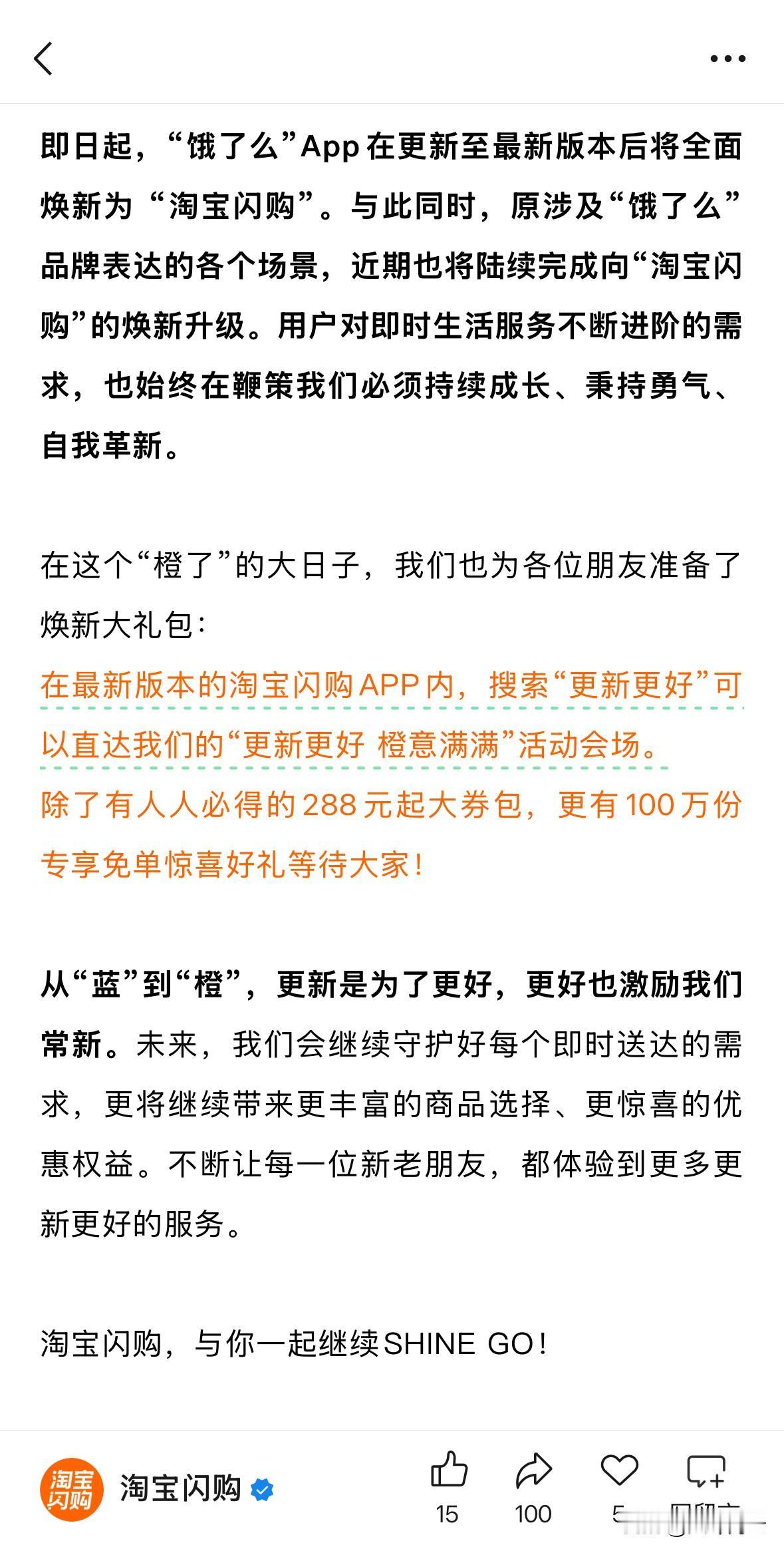 “饿了么”成为历史,今天饿了么官方发文称,饿了么平台将改名“淘宝闪购”,看来是阿里已经完成对饿了么的收购。马总沉默了几年后还是放弃不下搞收购搞垄断这一套路。个人觉得“饿了么”这个名字还是挺好的,比抖音的同款竞争对手“快手”的名称好多了,为什么要改呢?如今美团,淘宝和京东又在外卖领域三分天下了! 饿了么淘宝外卖 淘宝闪购外卖 淘宝闪购外卖券 饿了么新模式 饿了么淘闪购 饿了么新规 阿里淘宝闪购