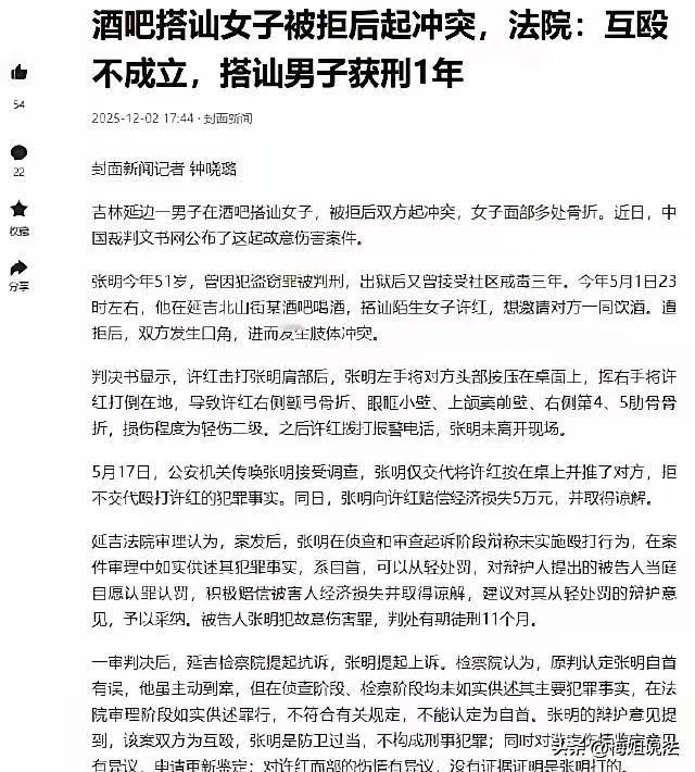 吉林延边,51岁男子张明在酒吧喝酒,见女子许红漂亮便上前搭讪邀其共饮,被拒后觉得没面子吵起来。许红气愤打了他肩膀一下,张明反手将许红头按在桌上挥拳猛打,致其面部骨折、肋骨断裂,构成轻伤二级。一审法院认为张明有自首情节从轻处罚,判其有期徒刑11个月,然而二审出现反转。 这起案件,表面上看似一起普通的酒吧冲突,但背后隐藏的是我们每个人都可能面临的人性考验和社会价值的碰撞。51岁的张明,是个普通的中年男子,或许生活的压力让他脾气变得易怒,也许他心中存有些自尊的伤痕。那天,在灯火阑珊的酒吧里,他看到一个漂亮的女子许红,第一反应竟然是“搭讪”,这本无可厚非,毕竟每个人都渴望被关注、被欣赏。 然而,当被拒绝时,张明的反应却突然变得激烈——从最初的尴尬、失落,到愤怒、冲动,最终酿成了不可挽回的悲剧。许红的气愤之举,或许只是出于情绪的发泄,却引发了张明的极端反应。头按在桌上、挥拳猛打,直至面部骨折、肋骨断裂。这样的暴力场面,令人震惊,也让人思考:到底是什么让一个人失控到如此地步?是个人的情绪失控,还是社会中隐藏的某种“隐形伤痕”? 更令人深思的是法院的判决。一审法院考虑到张明有自首情节,判处11个月有期徒刑,从表面看似乎是“宽容”的判决,但二审的出现,带来了截然不同的声音。是不是太轻了?一场普通的酒吧争执,竟然演变成如此严重的伤害事件,难道我们的大众安全感就这样被轻描淡写地抹去? 这案子,折射出的是当下社会中人与人之间的“界限”和“底线”。我们每个人都在被生活的压力、焦虑、孤独所包围,而冲动、暴力、仇恨似乎成为一些人释放情绪的唯一出口。可是,真正的勇气,是在面对冲突时选择理智,在被拒绝时还能保持尊重;而非用拳头和暴力来解决问题。 读到这里,你是不是也在心里默默问自己:如果换做是我,会怎么做?我们都希望这个世界变得更温暖,但每一次的冲动、每一次的失控,是否都在无形中拉远了彼此的距离? 这起案件提醒我们:每个人都可能在某个瞬间失控,但更重要的是,我们要学会控制情绪,学会尊重他人。只有这样,社会才能少一些伤痛,多一些理解与包容。毕竟,善意和理智,才是我们走向美好未来的最大力量。 你怎么看?面对类似的冲突,你会选择怎样的态度?欢迎在评论区留下你的看法,让我们共同讨论,寻找那份属于每个人的“理性与温暖”。怎样战胜自己面对人生的种种磨难? 做人最可贵的是什么?