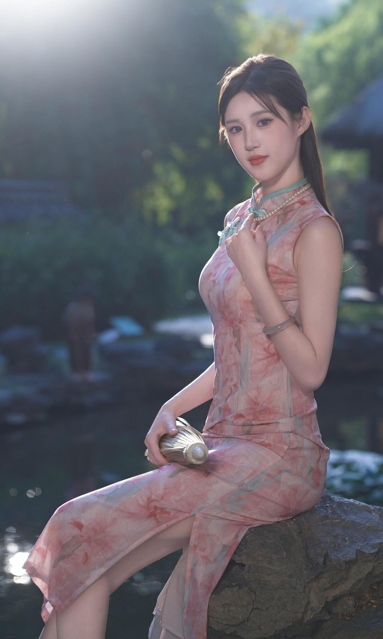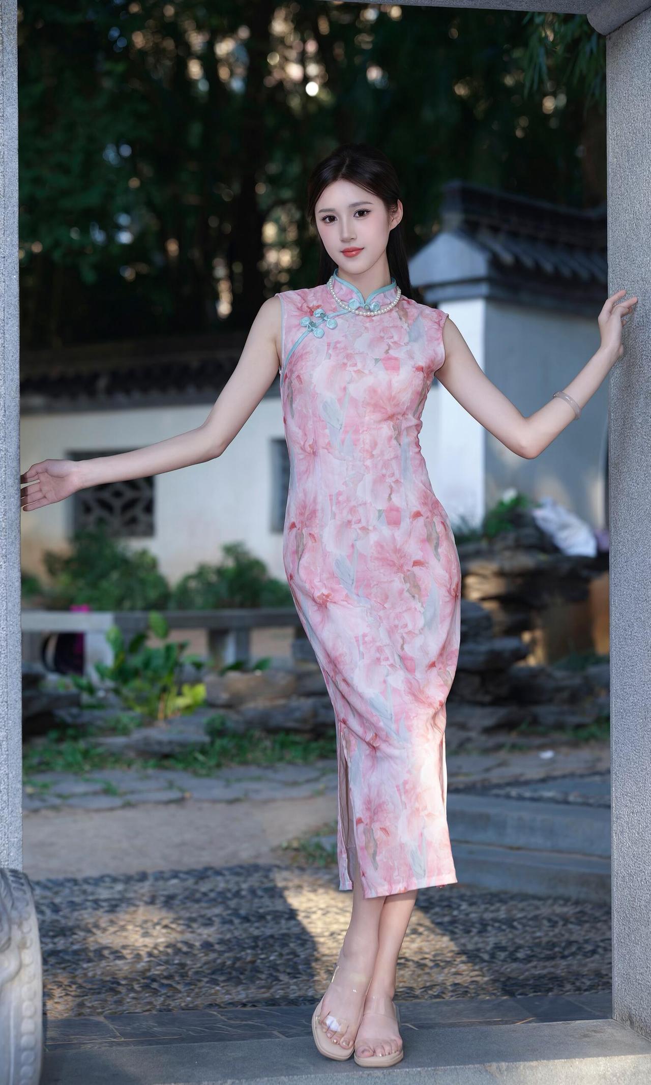 要让江南的风,先绕过粉墙黛瓦,再轻轻掀起这袭烟粉旗袍的裙摆。 檐下光影碎在珍