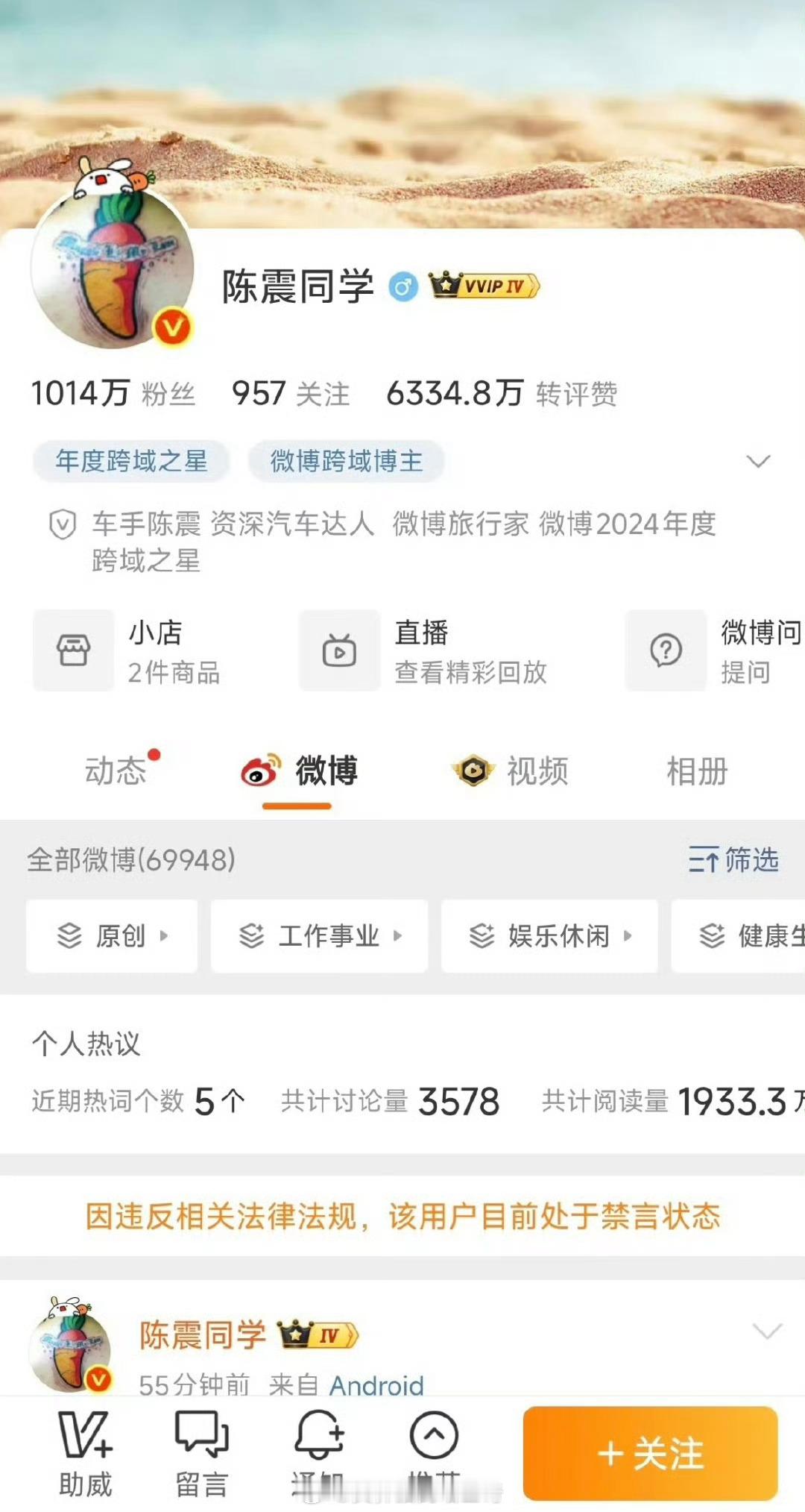 陈震被禁言陈震被全网禁言?他这是咋了?我只能怀疑是捐款的事儿。