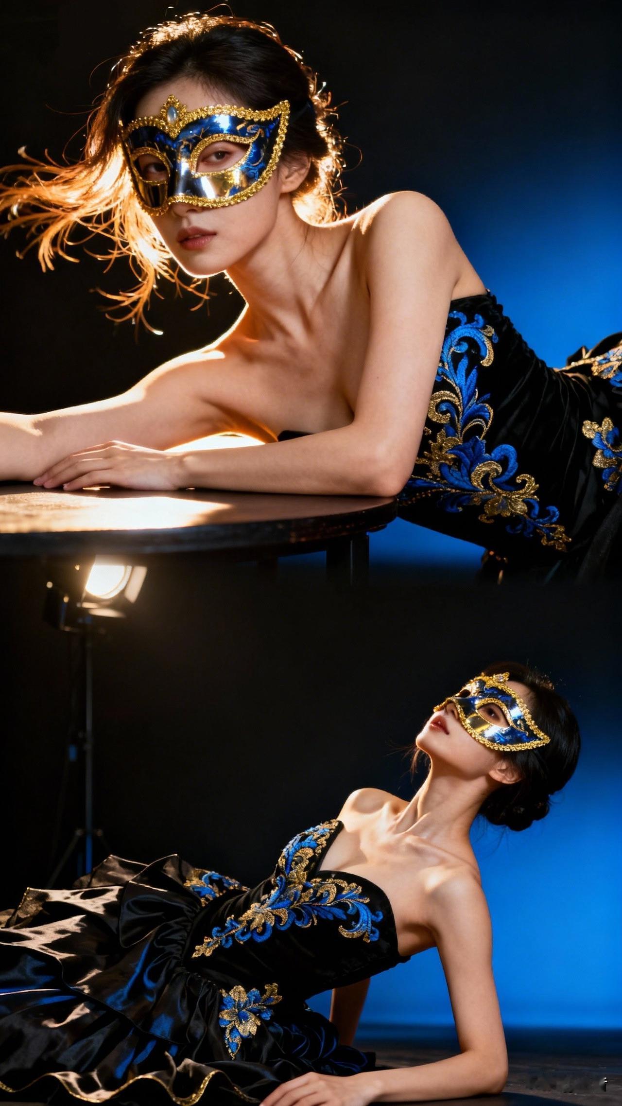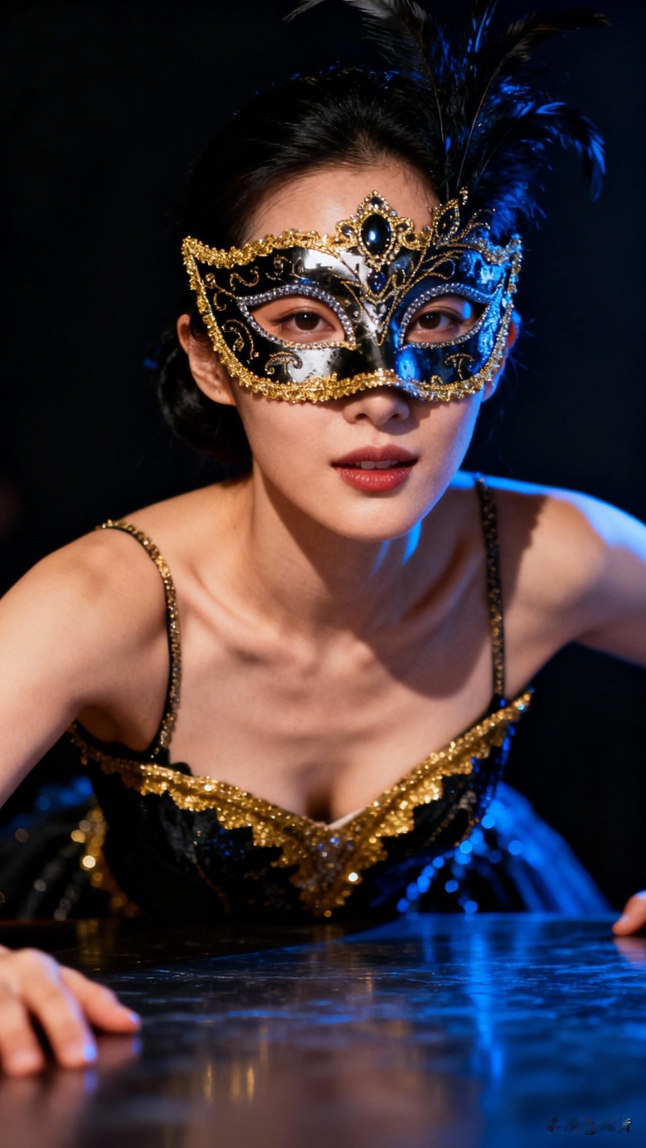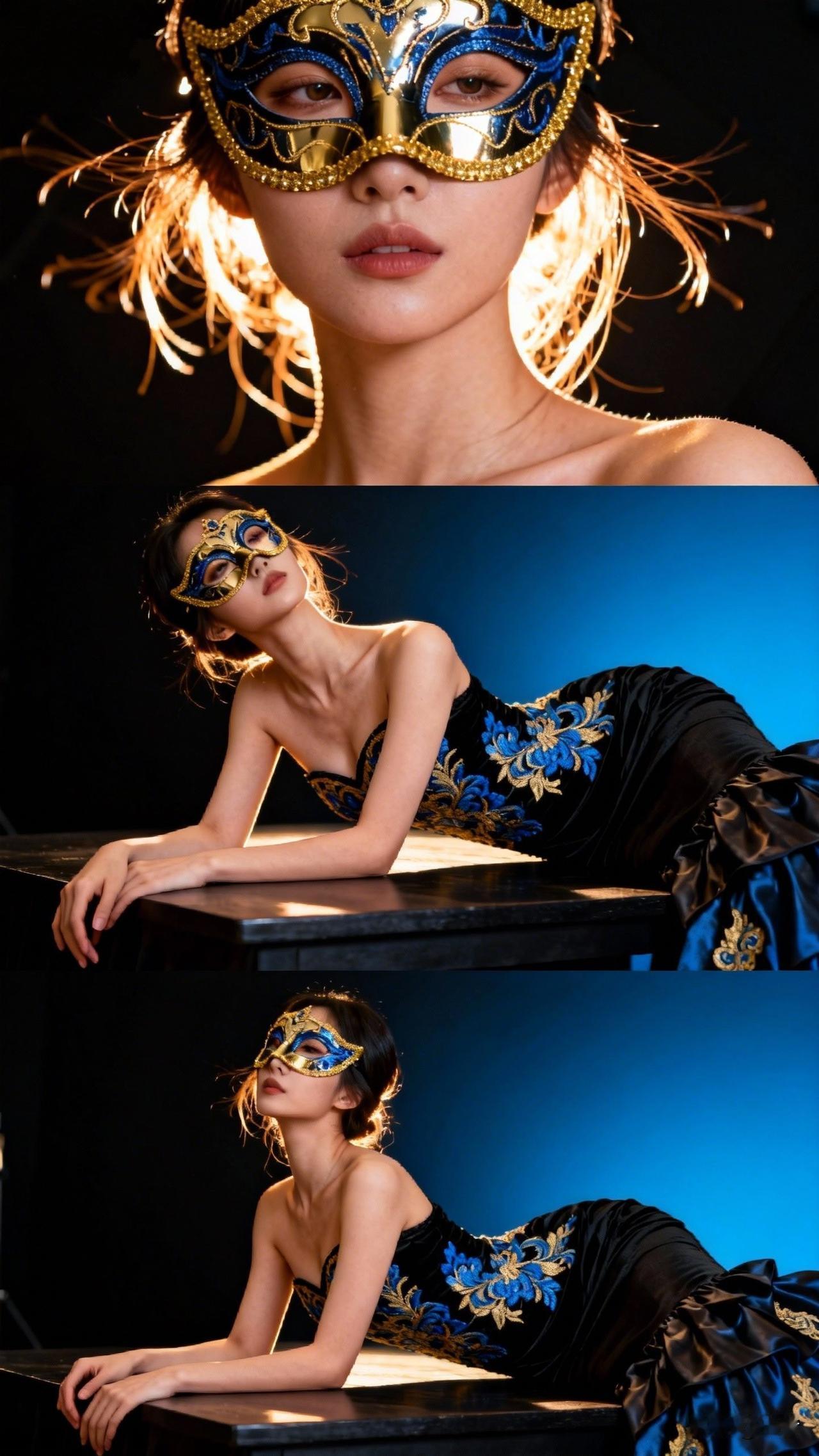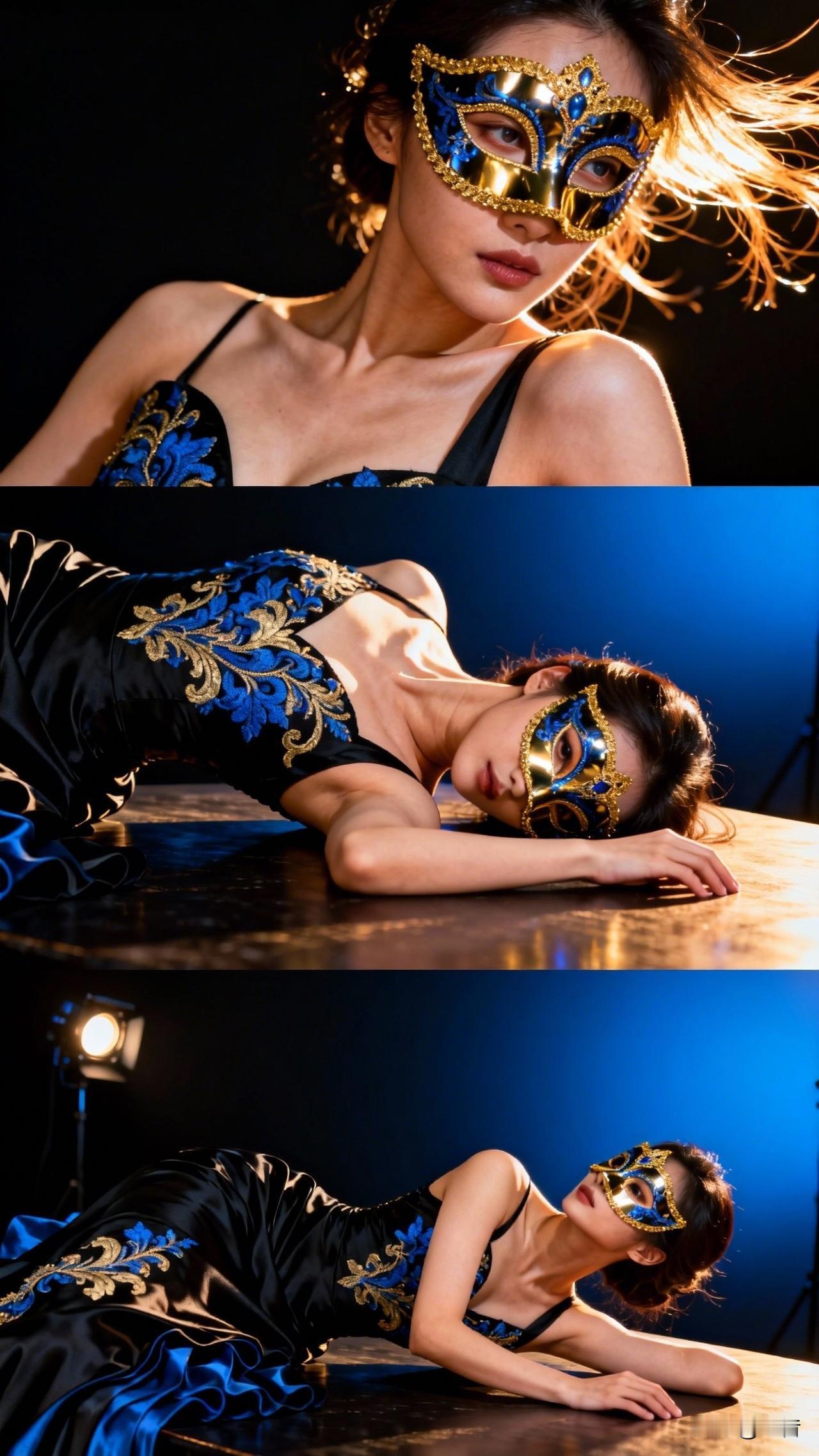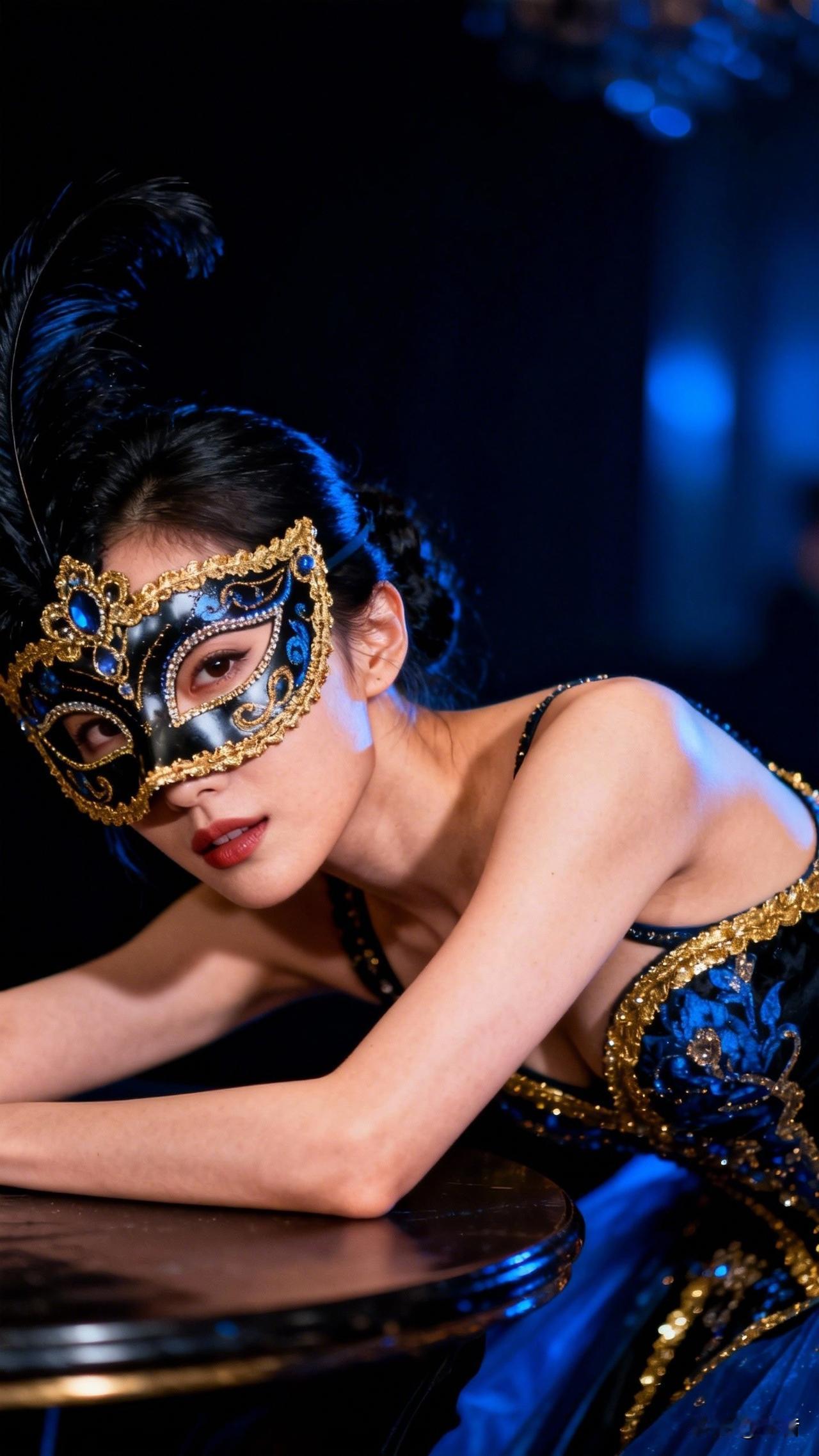 面具遮住半张脸 她俯身刹那 鎏金纹路在幽蓝绸缎上游走 半遮面美女