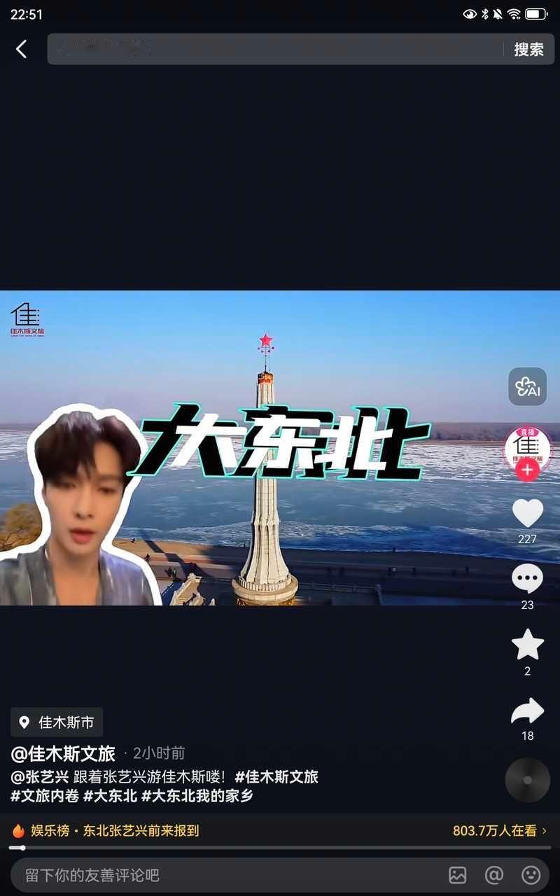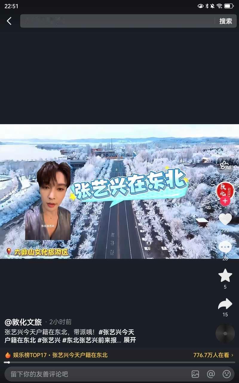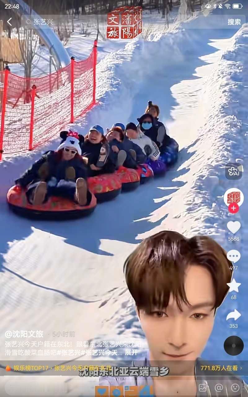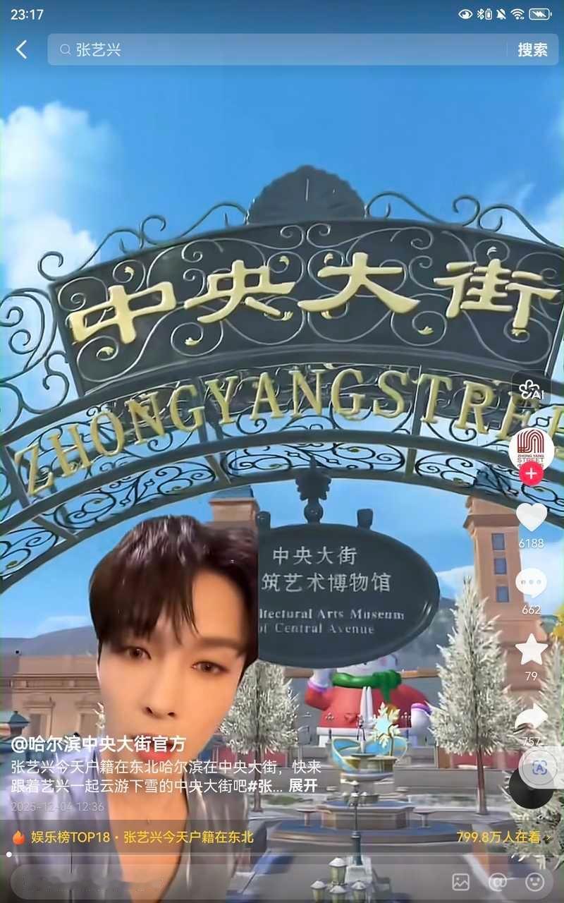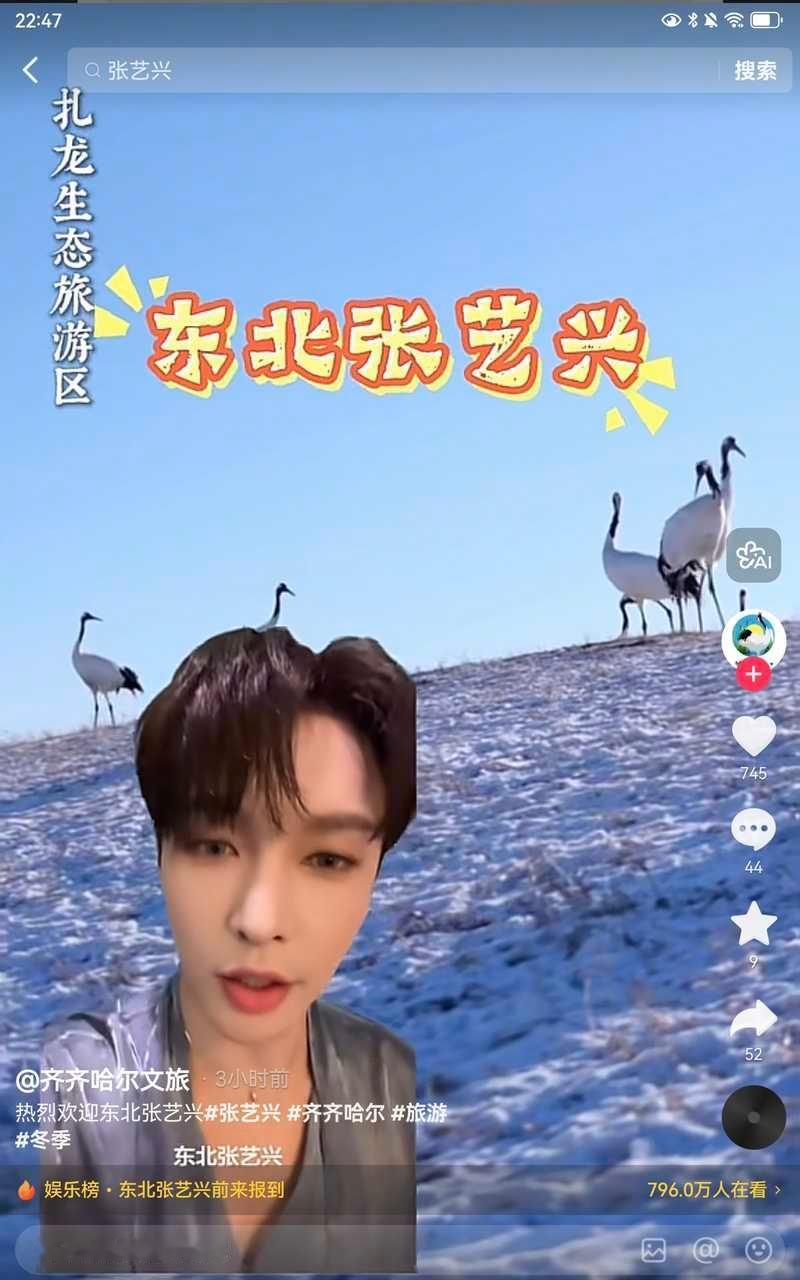 张艺兴中午在抖发了唱《大东北是我的家乡》的歌,还不到三小时点赞就破百万了,然后一堆东北的文旅官号发了二创视频。张艺兴变成了东北张艺兴