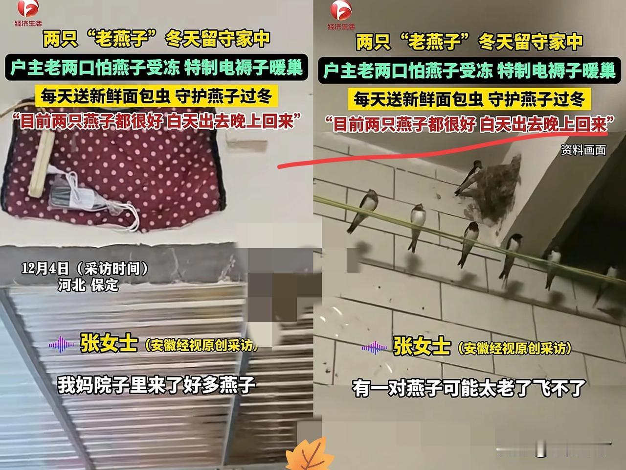 万物皆有灵!河北保定,两只老燕子无力南飞,其他燕子站成一排依次告别,户主老两口看得心头发软,当即决定要护这两只老燕子过冬! 怕它们挨冻,就买来电褥子细心裁好,轻轻裹住燕巢,把寒风死死挡在外面! 怕它们饿肚子,每天准时投喂新鲜面包虫,把小小的燕巢宠成了“冬日避风港”! 如今两只老燕子早已摸清了节奏,白天自在觅食,傍晚准时归巢,把老人的善意当成了最安心的归宿! 要知道燕子生性警惕,从不会轻易依赖人类,可它们愿意每天飞回这个被精心守护的小窝,这份双向的信任,比任何温情话语都更戳人! 网友笑问“燕子半夜醒了会不会嘴干”,调侃里满是藏不住的柔软! 其实这世间最珍贵的从不是什么惊天动地的善意,而是有人愿意为弱小生命停下脚步,用细碎的温柔,撑起一整个冬天的温暖~ 这份建立在人与动物之间的温情,比什么都温暖!