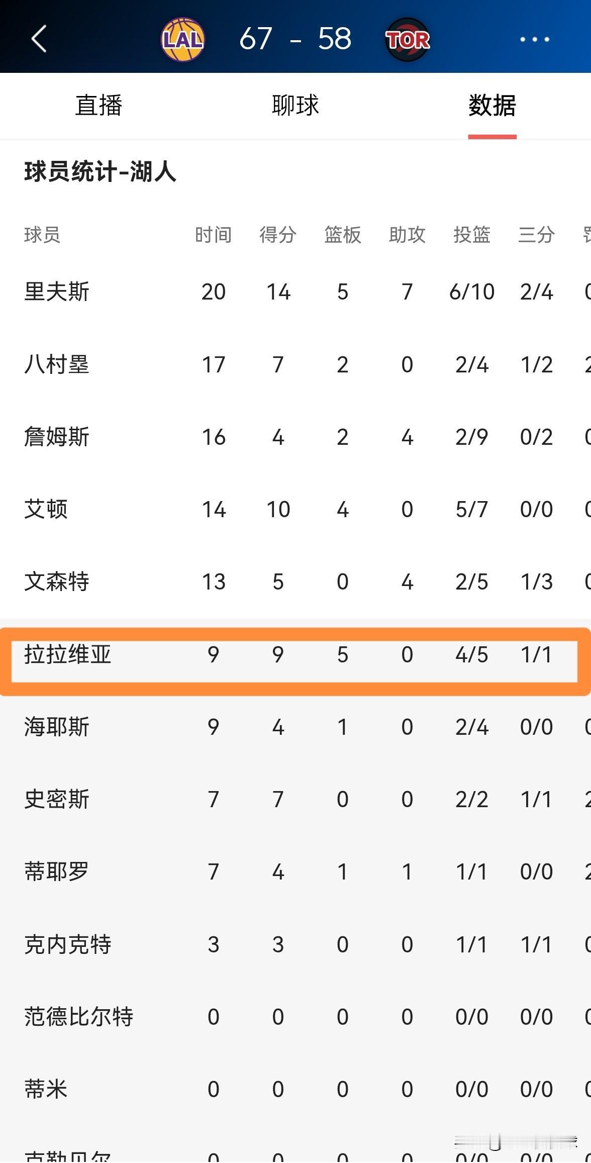 湖人新星拉拉维亚终于活过来了!今天湖人在客场挑战猛龙,目前双方的上半场比赛已经结束,湖人以67:58领先对手。让人感到非常兴奋的是,拉拉维亚终于找回了久违手感,他在替补出战的9分钟里,投篮5中4,其中三分球1中1极其高效的砍下9分5篮板1抢断。 今天的拉拉维亚才是我们熟悉的拉拉维亚,期待他可以在下半场比赛中打出更加精彩的表现。