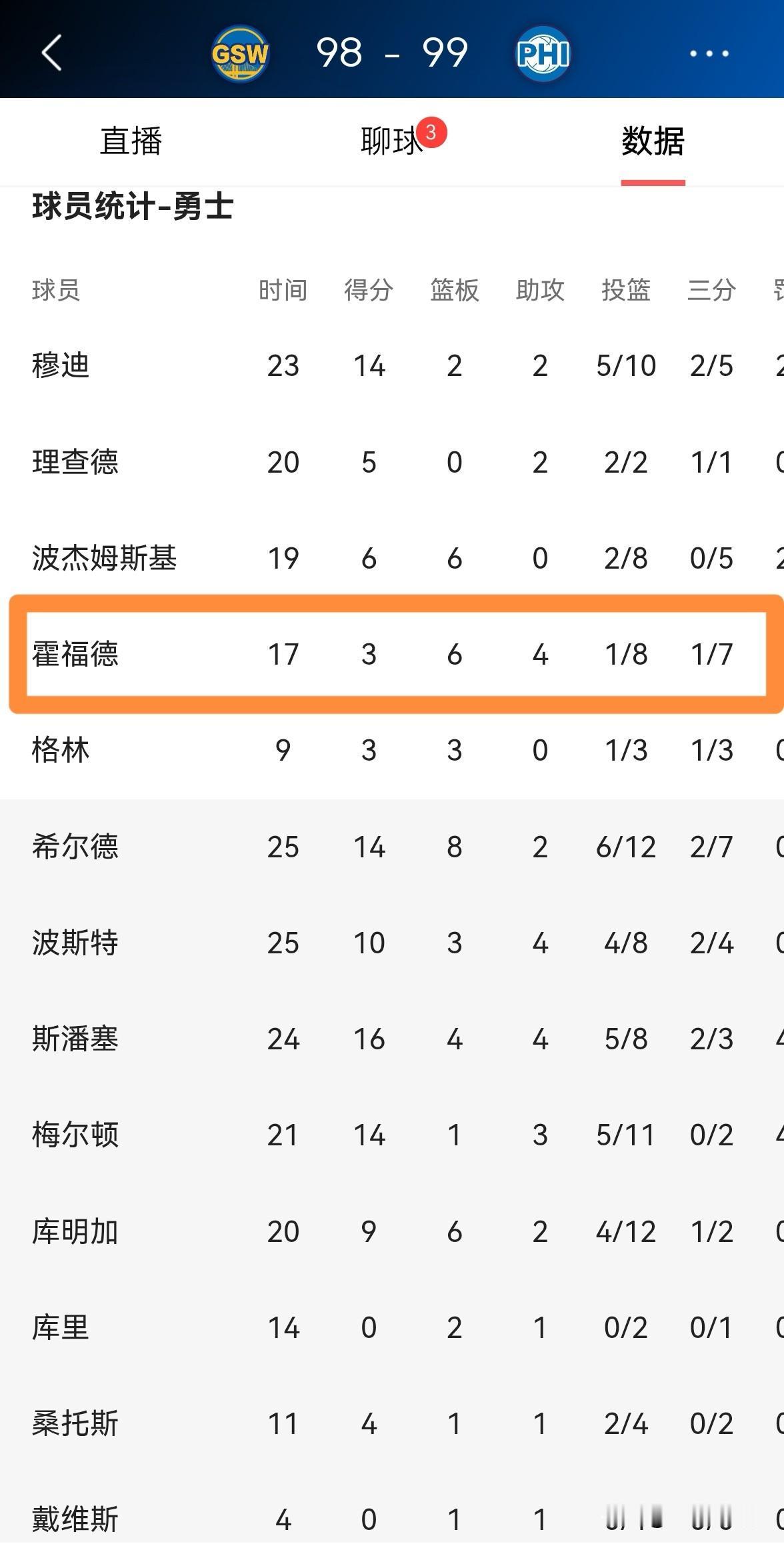 我强烈建议勇士立刻裁掉霍福德!在今天勇士客场以98:99惜败于76人的比赛中,霍福德的表现真是一团糟。 全场比赛下来,霍福德首发出战17分钟,投篮8中1,其中三分球7中1无比低效的得到3分。 毫不客气的说,如果霍福德能够多投进一记三分球,勇士就能赢下本场比赛,可是霍福德的表现完全就是一场大灾难。