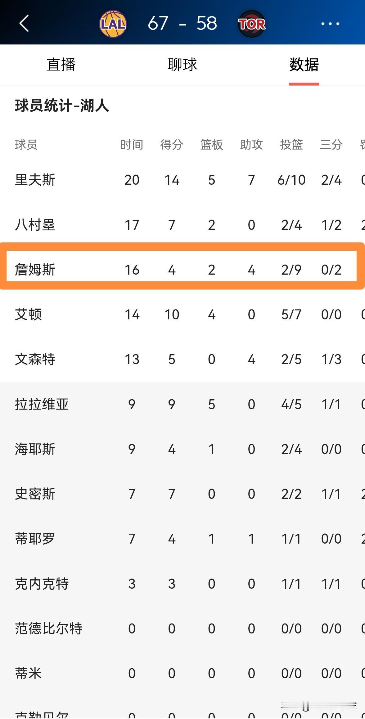 湖人老将詹姆斯真是黯然失色!在今天进行的湖人和猛龙的比赛中,目前双方半场战罢,湖人以67:58领先对手。值得一提的是,在前两节比赛中,詹姆斯完全是出工不出力,他在首发出战的16分钟里,投篮9中2仅仅得到可怜的4分。 以詹姆斯目前的糟糕状态来看,湖人主帅雷迪克应该在下半场比赛中弃用詹姆斯,不然的话湖人很有可能会输球。