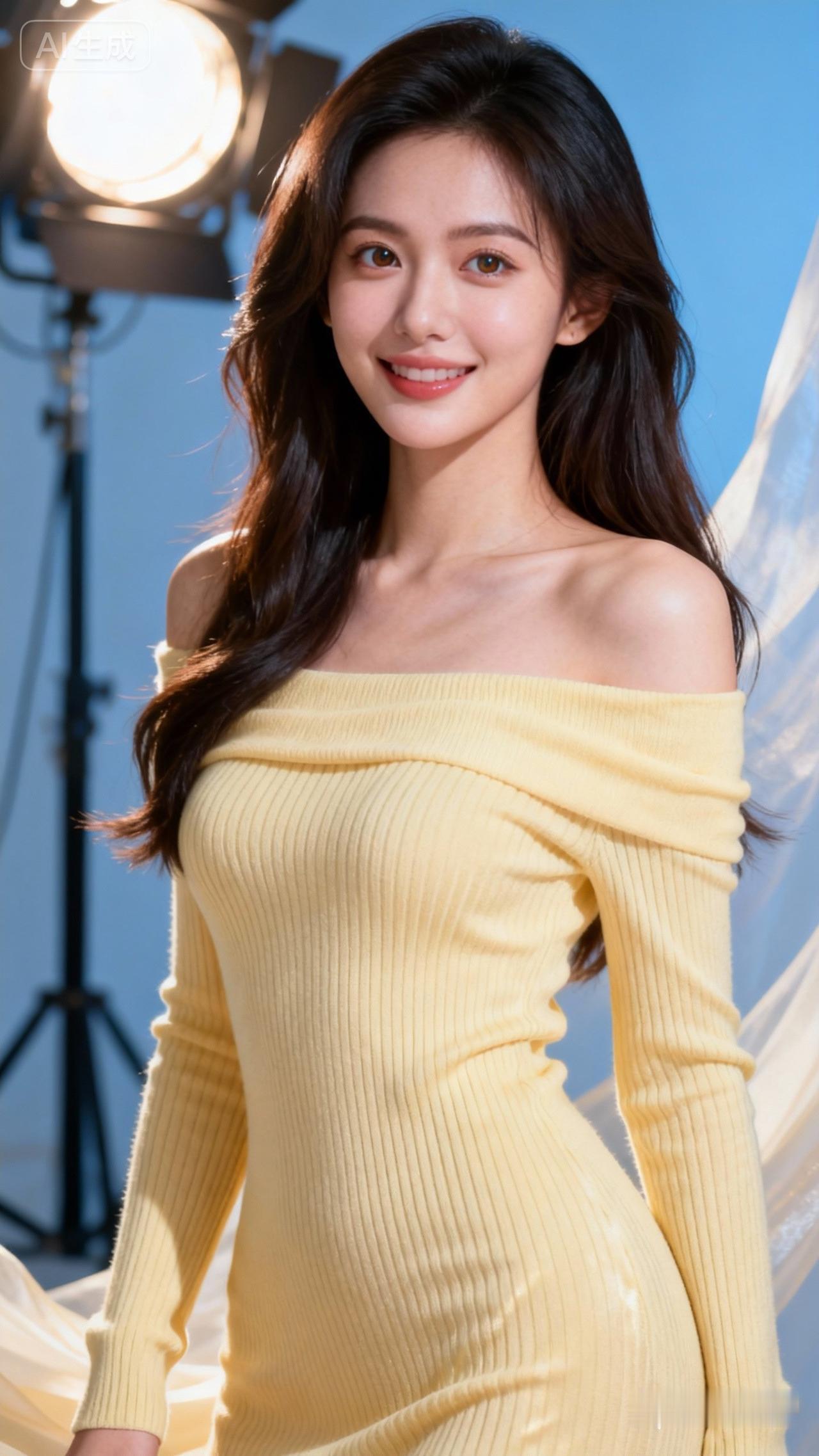 温柔甜美的黄色露肩毛衣,搭配自然妆容,尽显优雅气质!🌟✨