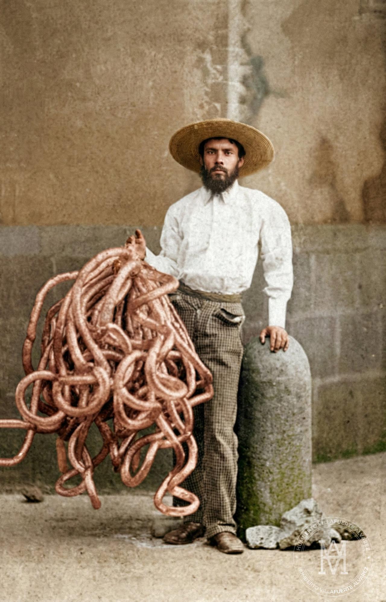 一张修复并上色的1870年照片,照片来自Cruces y Campa收藏,描绘了一位墨西哥街头小贩,他手里拿着几捆充气的动物内脏。在塑料制品出现之前,这些内脏被用作可重复使用的袋子,用来储存大米和豆类等谷物,或者用来包装田间午餐。 Humberto Villafuerte将这张照片与他父亲童年时期对这类小贩的记忆联系起来,阐述了在19世纪的墨西哥,动物内脏如何成为现代包装的一种多功能、可生物降解的替代品,这种做法根植于资源匮乏和可持续发展的理念。 除了用来在家制作西班牙辣香肠(chorizo)之外,它还像我们今天用塑料袋一样,被人们用来装各种种子——大米、小麦、豆类等等——放在厨房储存;或者装满食物带到田里,以便在劳作时食用。照片经过修复和着色,拍摄于1870年,出自克鲁塞斯·坎帕(Cruces y Campa)收藏。 人们可以想象,他们是如何利用这些内脏来保持卫生的,但这些内脏被清洗干净,晾干并充气后就可以使用了;然而,我们吃晒干的肉,猪皮仍然用于制作龙舌兰酒,猪肠仍然用于制作香肠。