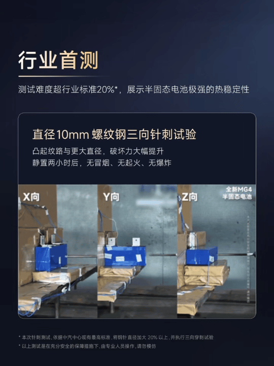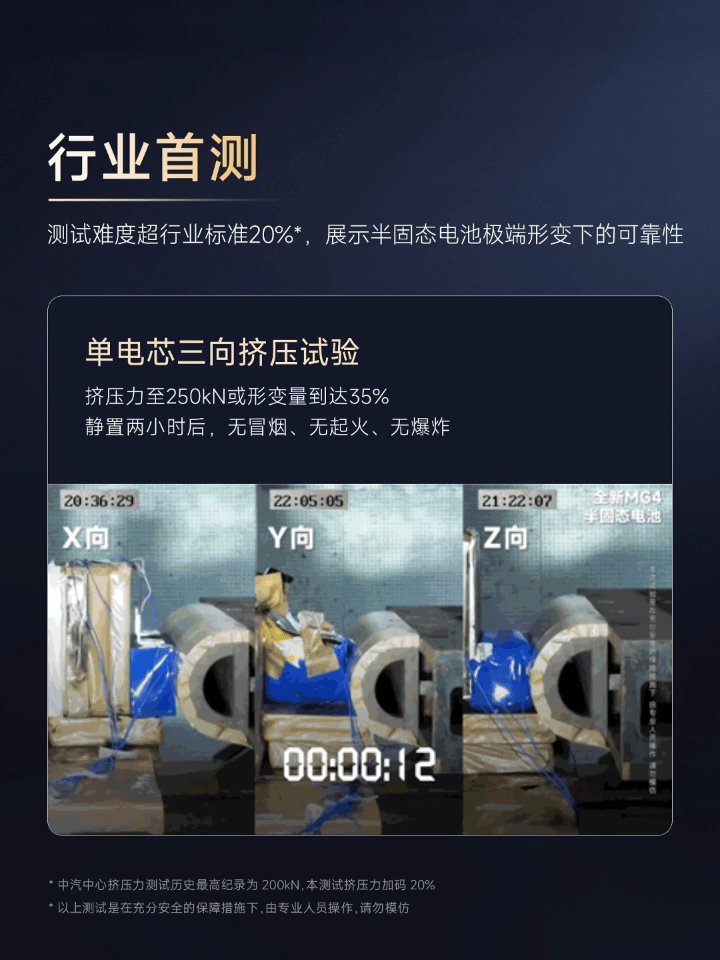 上汽全新MG4固态电池安全试验两项行业首测,难度超行业标准20%! 直径10mm 螺纹钢三向针刺试验,静置2小时后无冒烟、无起火、无爆炸。 单电芯三向挤压试验,静置2小时后无冒烟、无起火、无爆炸。 三向穿刺,面面俱安 三向挤压,处处稳固 上汽全新MG4半固态电池,以硬核测试筑牢安全防线!