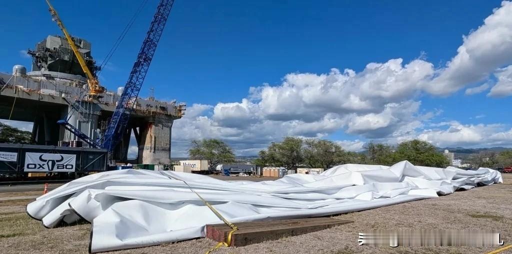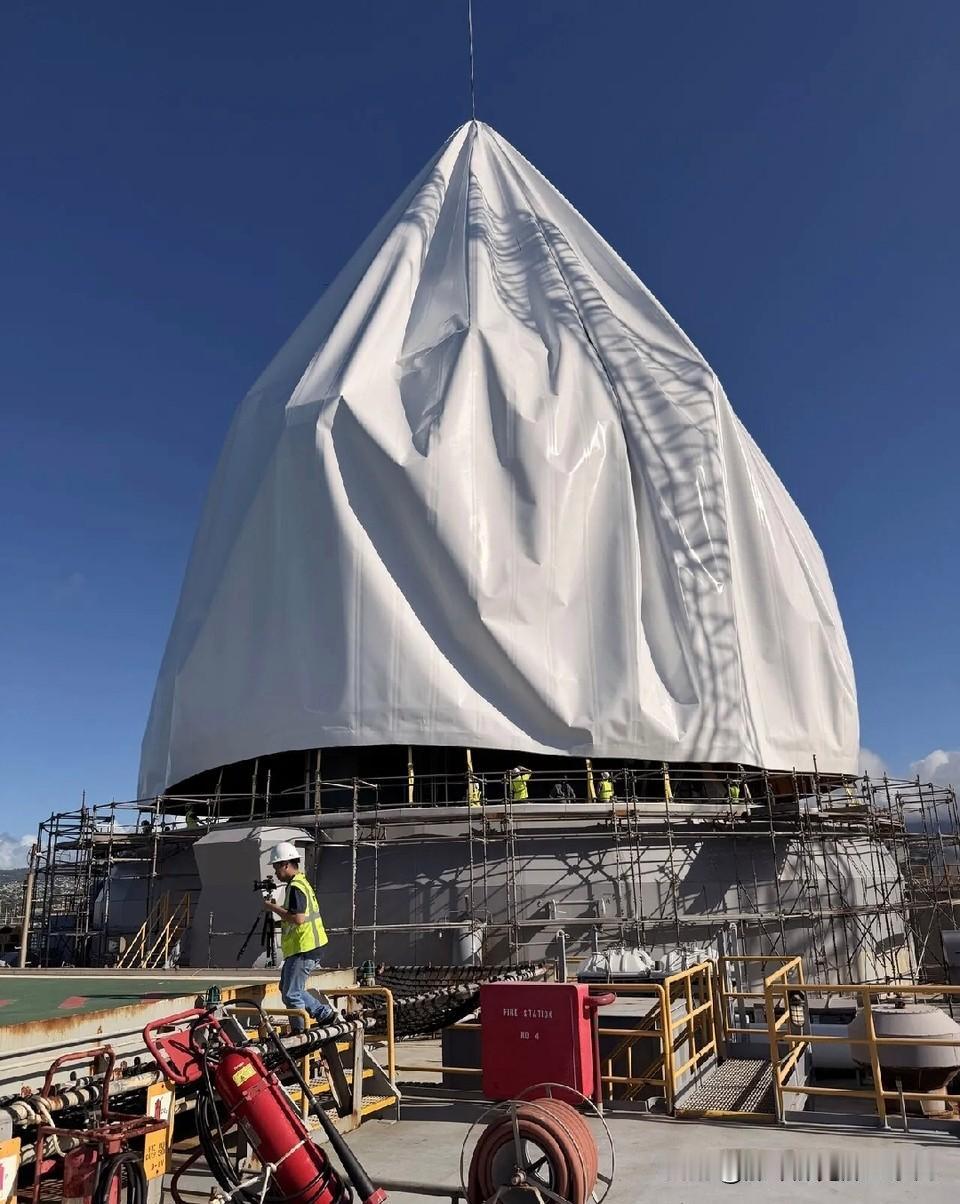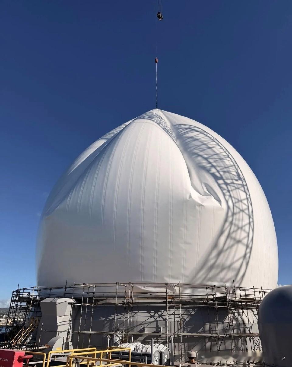 雷达罩原来不是硬壳啊... 不该是两边能合起来两大块装甲吗??至少能防御个rpg之类的吧? 没想到,万万没想到居然是外布包起来的,里面原来是这样的,我知道他是一个外面的包着的,里面是机器! 【图8】还有这艘由自航式钻井平台改装而成的弹道导弹跟踪传感器航行器在海上的的运动方式也好奇怪啊!