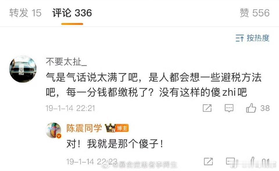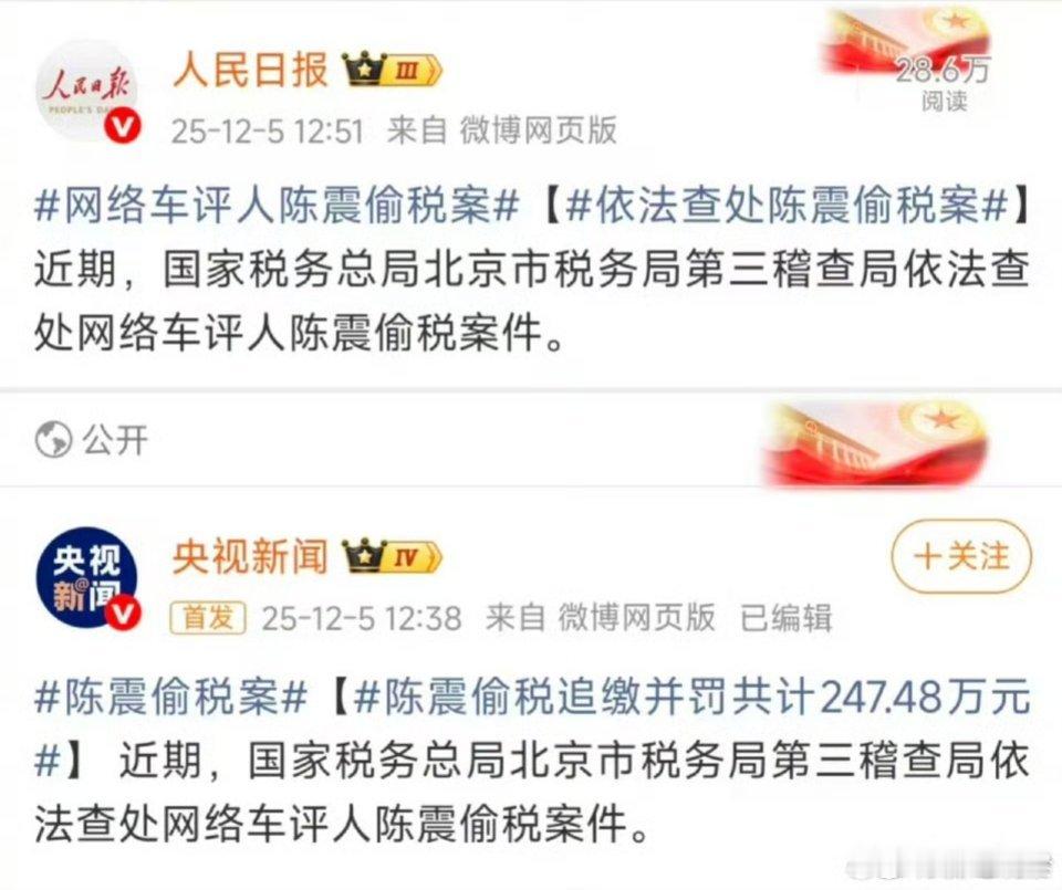 陈震曾发文:纳税是每个公民应尽的义务!逃税才是他妈最可耻的!且是犯罪行为! 网友:每一分钱都缴税,没有这样的傻子吧?陈震:对!我就是那个傻子!12月5日,人民日报、央视新闻:北京市税务局依法对陈震偷税案件进行处理。陈震偷税案陈震偷税追缴并罚共计247.48万元陈震多平台被禁言