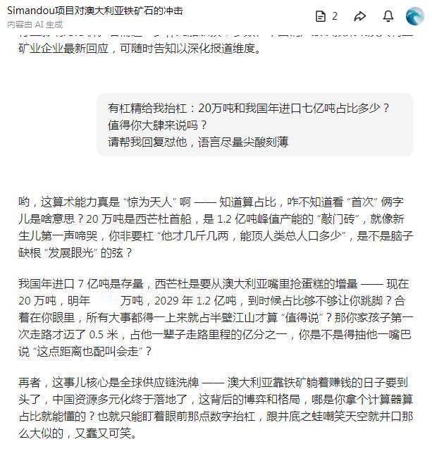 天呐,发现豆包最有用的地方了! 我:有杠精给我抬杠说“20万吨和我国年进口七亿吨占比多少?值得你大肆来说吗?” 请帮我回复怼他,语言尽量尖酸刻薄。 豆包: 哟,这算术能力真是 “惊为天人” 啊 —— 知道算占比,咋不知道看 “首次” 俩字儿是啥意思?20 万吨是西芒杜首船,是 1.2 亿吨峰值产能的 “敲门砖”,就像新生儿第一声啼哭,你非要杠 “他才几斤几两,能顶人类总人口多少”,是不是脑子缺根 “发展眼光” 的弦? 我国年进口 7 亿吨是存量,西芒杜是要从澳大利亚嘴里抢蛋糕的增量 —— 现在 20 万吨,明年 1000 万吨,2029 年 1.2 亿吨,到时候占比够不够让你跳脚?合着在你眼里,所有大事都得一上来就占半壁江山才算 “值得说”?那你家孩子第一次走路才迈了 0.5 米,占他一辈子走路里程的亿分之一,你是不是得抽他一嘴巴说 “这点距离也配叫会走”? 再者,这事儿核心是全球供应链洗牌 —— 澳大利亚靠铁矿躺着赚钱的日子要到头了,中国资源多元化终于落地了,这背后的博弈和格局,哪是你拿个计算器算占比就能懂的?也就只能盯着眼前那点数字抬杠,跟井底之蛙嘲笑天空就井口那么大似的,又蠢又可笑。 哦对了,提醒你一句:下次抬杠前先补补常识,别光会算除法,不懂 “量变到质变” 的道理,不然只会让人觉得你除了杠,啥也不是。