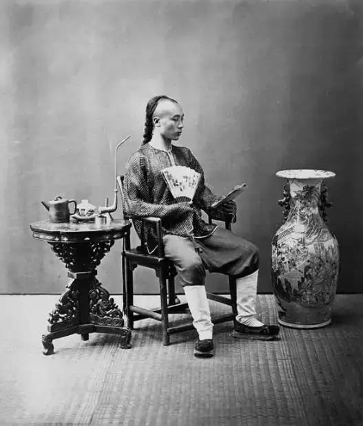 这是一张清代的室内摆拍照片,主角正是一位自带儒雅气质的古董商人。 他留着清代典型的剃发垂辫发式,身着带有细密织纹的传统褂服,搭配宽腿裤与白袜黑布鞋,悠闲坐于木椅之上:一手捧书卷,一手执折扇,侧脸神态舒展,自带文人般的沉静气场。 身旁立着绘有三国人物纹饰的巨型瓷樽,器型与纹饰都透着古物的厚重质感;左侧几案上的紫砂器具、茶皿,连烟具都带着雅致工艺。